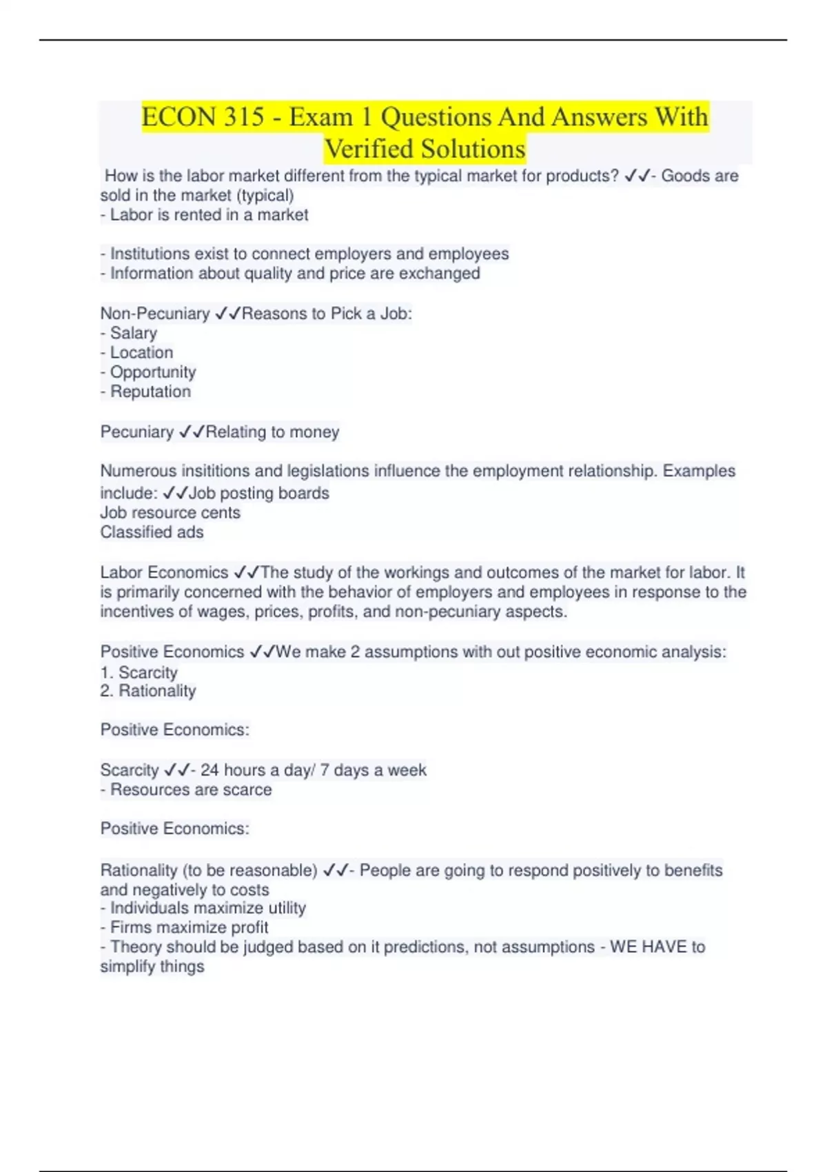 ECON 315 - Exam 1 Questions And Answers With Verified Solutions How is the labor market different from the typical market for products? - Goods are sold in the market (typical) - Labor is rented in a market - Institutions exist to connect employers and employees - Information about quality and price are exchanged Non-Pecuniary Reasons to Pick a Job: - Salary - Location - Opportunity - Reputation Pecuniary Relating to money Numerous insititions and legislations influence the employment relationship. Examples include: Job posting boards Job resource cents Classified ads Labor Economics The study of the workings and outcomes of the market for labor. It is primarily concerned with the behavior of employers and employees in response to the incentives of wages, prices, profits, and non-pecuniary aspects.