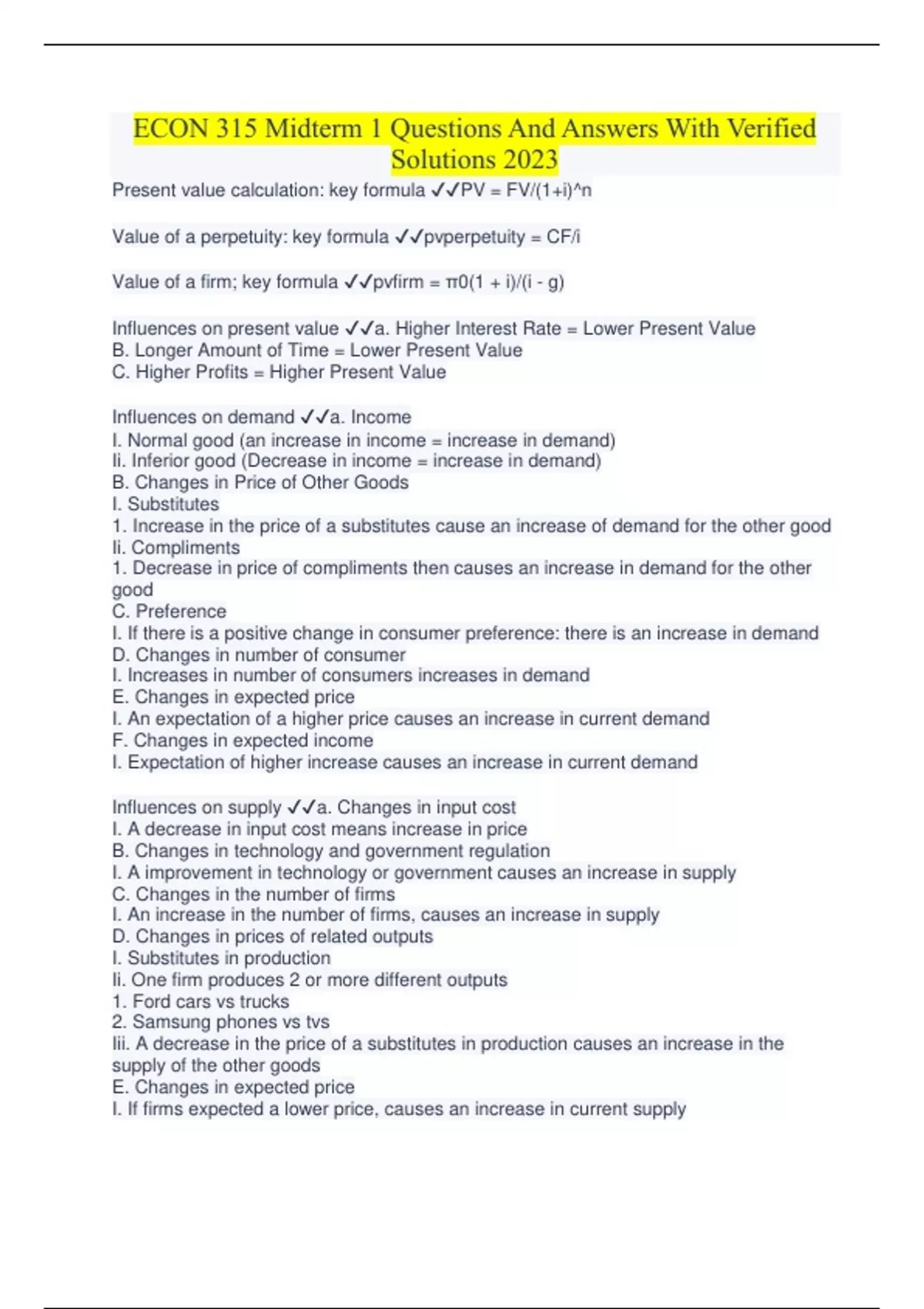 ECON 315 Midterm 1 Questions And Answers With Verified Solutions 2023 Present value calculation: key formula PV = FV/(1+i)^n Value of a perpetuity: key formula pvperpetuity = CF/i Value of a firm; key formula pvfirm = π0(1 + i)/(i - g) Influences on present value a. Higher Interest Rate = Lower Present Value B. Longer Amount of Time = Lower Present Value C. Higher Profits = Higher Present Value Influences on demand a. Income I. Normal good (an increase in income = increase in demand) Ii. Inferior good (Decrease in income = increase in demand) B. Changes in Price of Other Goods I. Substitutes 1. Increase in the price of a substitutes cause an increase of demand for the other good Ii. Compliments 1. Decrease in price of compliments then causes an increase in demand for the other good C. Preference I. If there is a positive change in consumer preference: there is an increase in demand D. Changes in number of consumer I. Increases in number of consumers increases in demand E. Changes in