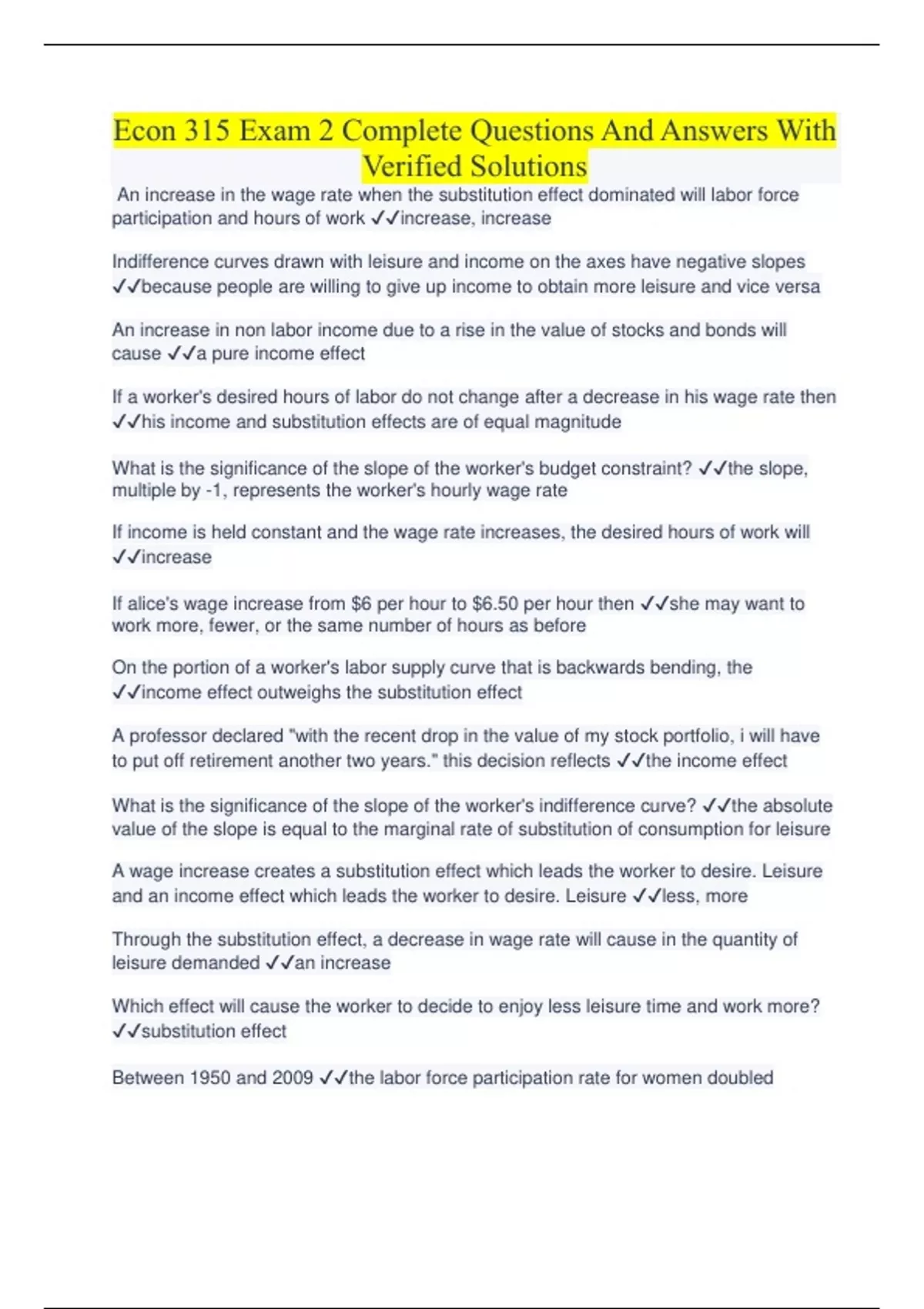 Econ 315 Exam 2 Complete Questions And Answers With Verified Solutions An increase in the wage rate when the substitution effect dominated will labor force participation and hours of work increase, increase Indifference curves drawn with leisure and income on the axes have negative slopes because people are willing to give up income to obtain more leisure and vice versa An increase in non labor income due to a rise in the value of stocks and bonds will cause a pure income effect If a worker's desired hours of labor do not change after a decrease in his wage rate then his income and substitution effects are of equal magnitude What is the significance of the slope of the worker's budget constraint? the slope, multiple by -1, represents the worker's hourly wage rate If income is held constant and the wage rate increases, the desired hours of work will increase If alice's wage increase from $6 per hour to $6.50 per hour then she may want to work more, fewer, or the same number of hours as before On the portion of a worker's labor supply curve that is backwards bending, the income effect outweighs the substitution effect