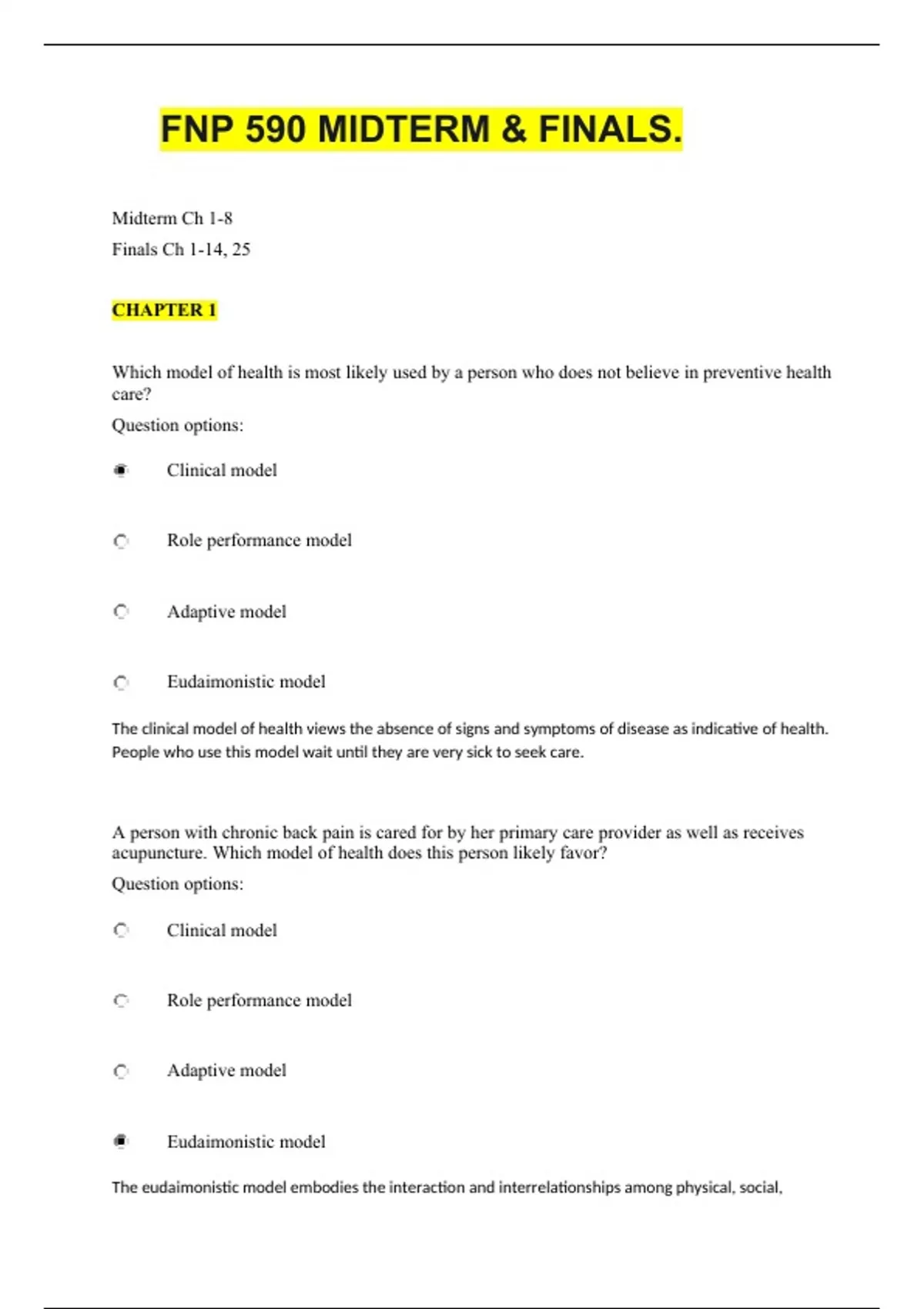 FNP 590 MIDTERM & FINALS. Midterm Ch 1-8 Finals Ch 1-14, 25 CHAPTER 1 Which model of health is most likely used by a person who does not believe in preventive health care? Question options: Clinical model Role performance model Adaptive model Eudaimonistic model The clinical model of health views the absence of signs and symptoms of disease as indicative of health. People who use this model wait until they are very sick to seek care. A person with chronic back pain is cared for by her primary care provider as well as receives acupuncture. Which model of health does this person likely favor? Question options: Clinical model Role performance model Adaptive model Eudaimonistic model The eudaimonistic model embodies the interaction and interrelationships among physical, social, psychological, and spiritual aspects of life and the environment in goal attainment and creating meaning in life. Practitioners who practice the clinical model may not be enough for someone who believes in the eudaimonistic model. Those who believe in the eudaimonistic model often look for alternative providers of care. A state of physical, mental, spiritual, and social functioning that realizes a person’s potential and is experienced within a developmental context is known as: Question options: