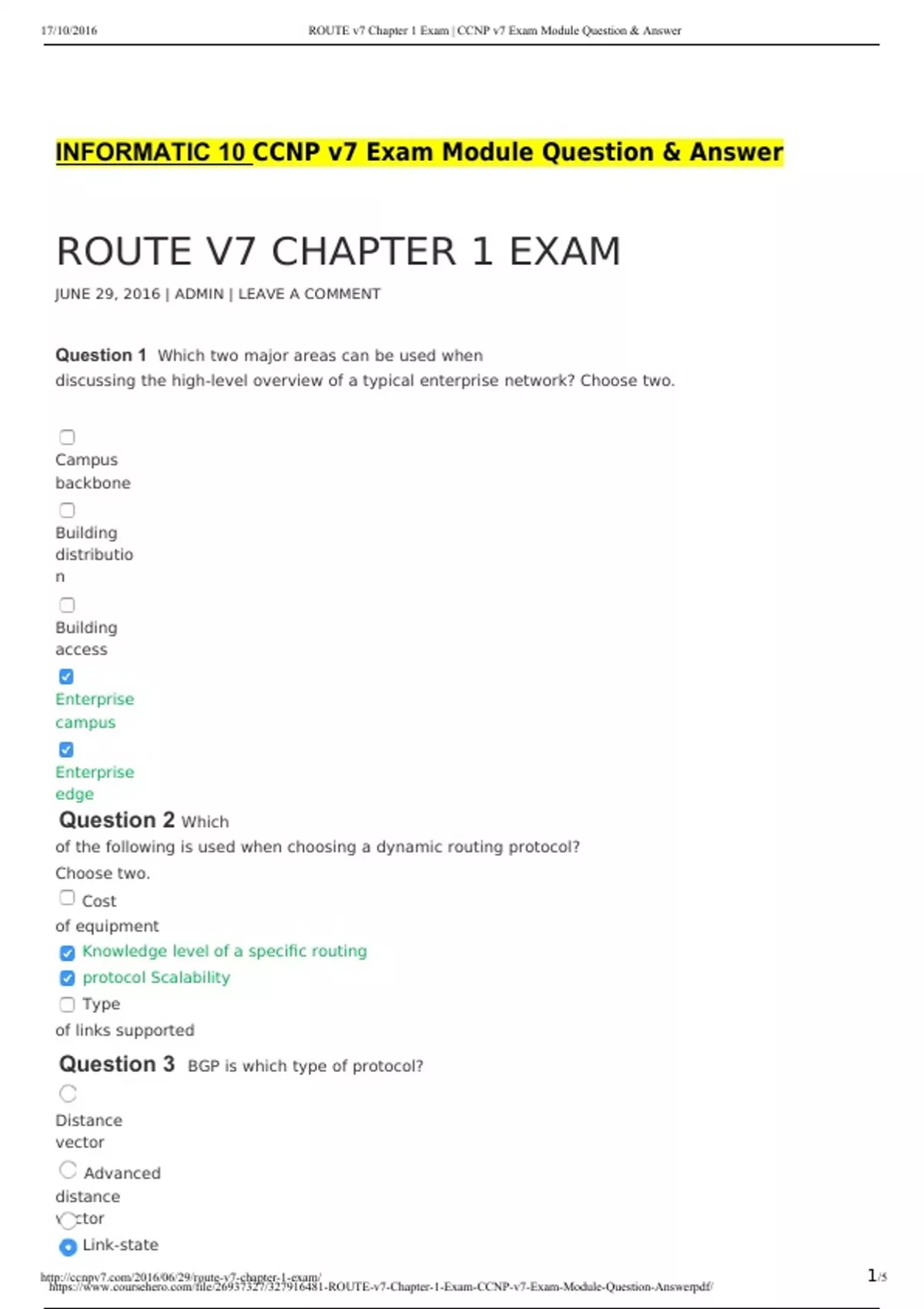 INFORMATIC 10 CCNP v7 Exam Module Question & Answer ROUTE V7 CHAPTER 1 EXAM JUNE 29, 2016 | ADMIN | LEAVE A COMMENT Question 1 Which two major areas can be used when discussing the high-level overview of a typical enterprise network? Choose two. Campus backbone Building distribution Building access Enterprise campus Enterprise edge Question 2 Which of the following is used when choosing a dynamic routing protocol? Choose