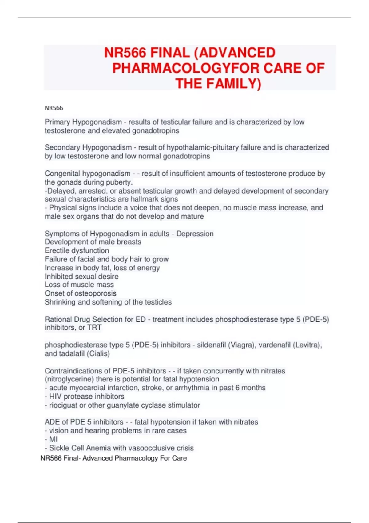 NR566 FINAL (ADVANCED PHARMACOLOGY FOR CARE OF THE FAMILY)|Primary Hypogonadism - results of testicular failure and is characterized by low testosterone and elevated gonadotropins....