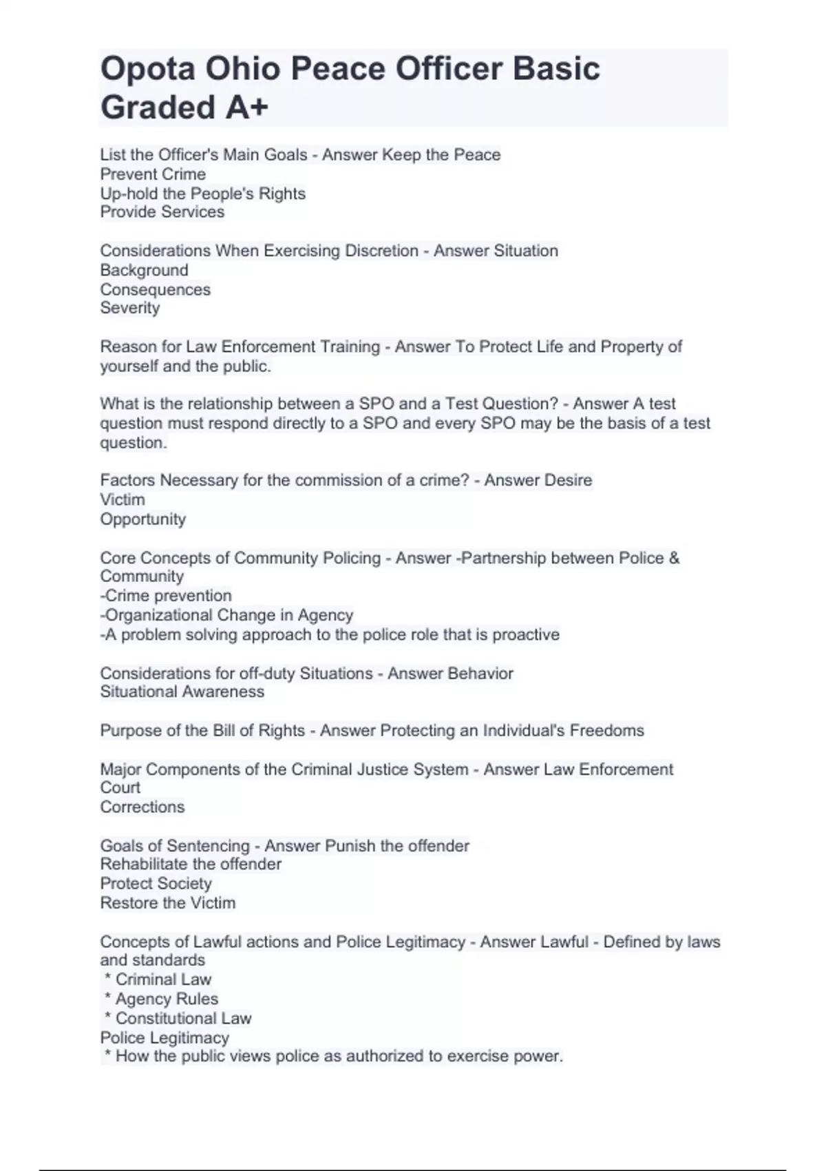 opota ohio peace officer basic questions and answers graded a