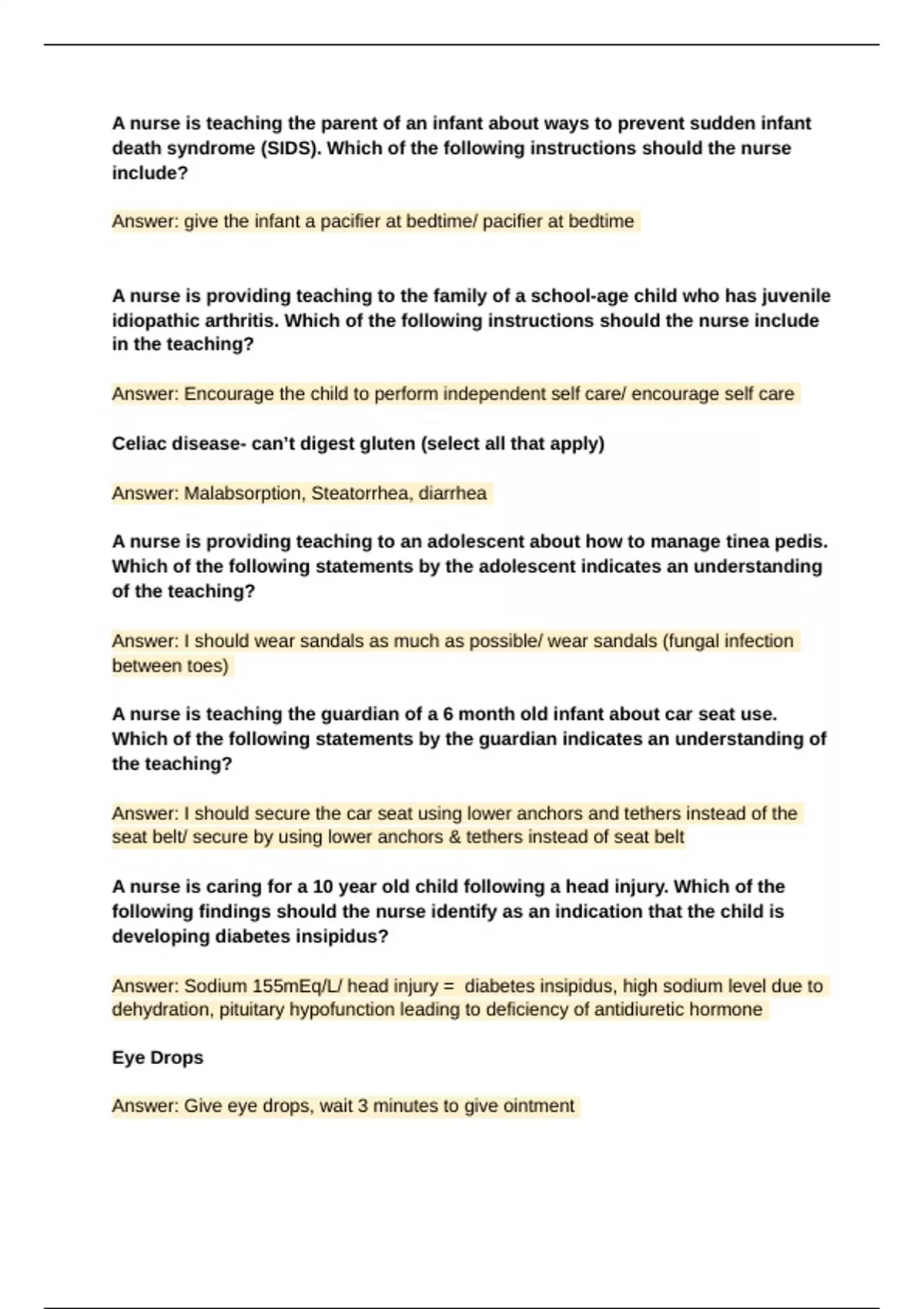 A nurse is teaching the parent of an infant about ways to prevent sudden infant death syndrome (SIDS). Which of the following instructions should the nurse include? Answer: give the infant a pacifi er at bedtime/ pacifier at bedtime A nurse is providing teaching to the family of a school-age child who has juvenile idiopathic arthritis. Which of the following instructions should the nurse include in the teaching? Answer: Encourage the child to perform independent self care/ encourage self care Celiac disease- can’t digest gluten (select all that apply) Answer: Malabsorption, Steatorrhea, diarrhea A nurse is providing teaching to an adolescent about how to manage tinea pedis. Which of the following statements by the adolescent indicates an understanding of the teaching?