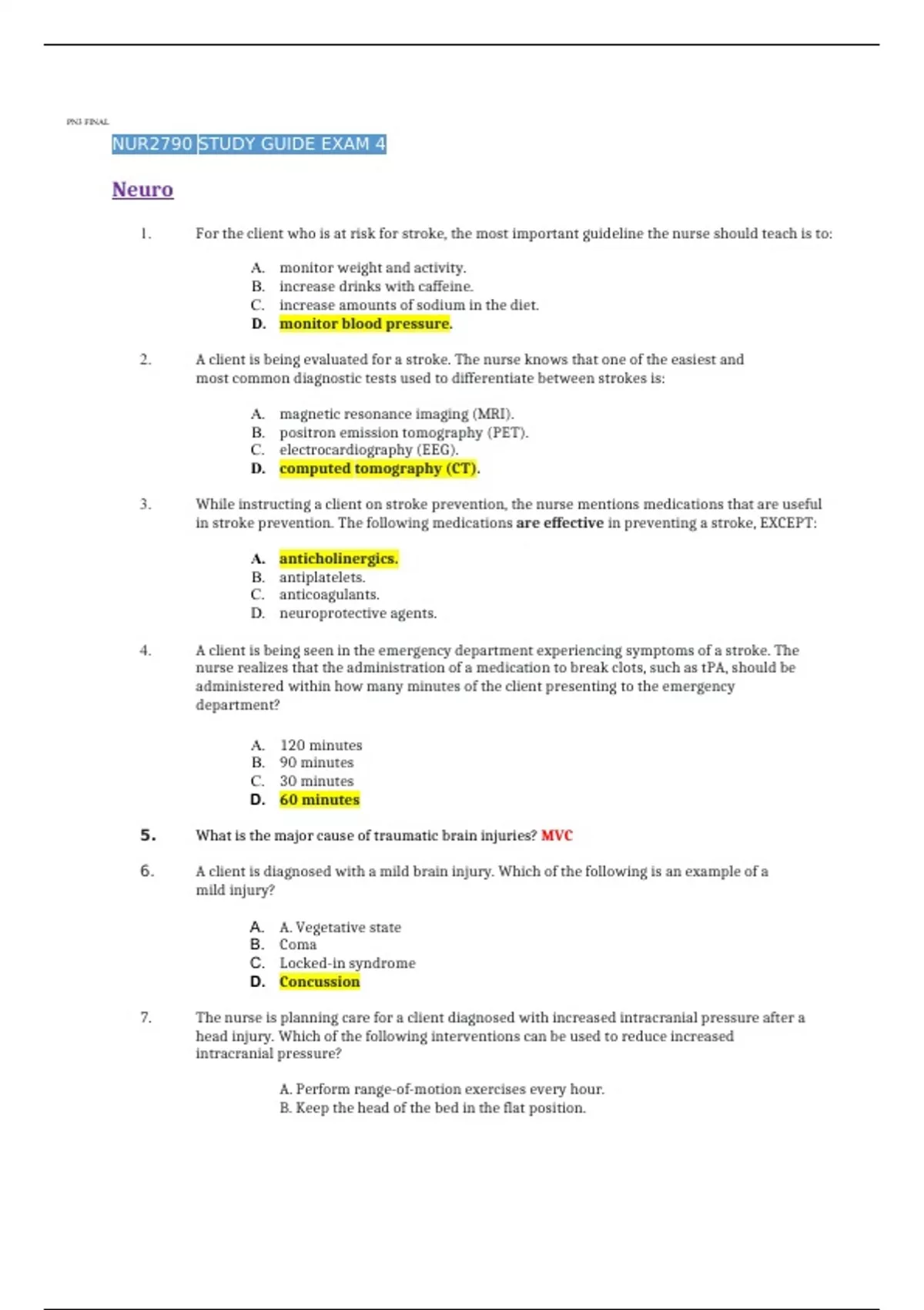 PN3 FINAL NUR2790 STUDY GUIDE EXAM 4 Neuro 1. For the client who is at risk for stroke, the most important guideline the nurse should teach is to: A. monitor weight and activity. B. increase drinks with caffeine. C. increase amounts of sodium in the diet. D. monitor blood pressure. 2. A client is being evaluated for a stroke. The nurse knows that one of the easiest and most common diagnostic tests used to differentiate between strokes is: A. magnetic resonance imaging (MRI). B. positron emission tomography (PET). C. electrocardiography (EEG). D. computed tomography (CT). 3. While instructing a client on stroke prevention, the nurse mentions medications that are useful in stroke prevention. The following medications are effective in preventing a stroke, EXCEPT: A. anticholinergics. B. antiplatelets. C. anticoagulants. D. neuroprotective agents. 4. A client is being seen in the emergency department experiencing symptoms of a stroke. The nurse realizes that the administration of a medication to break clots, such as tPA, should be administered within how many minutes of the client presenting to the emergency department? A. 120 minutes B. 90 minutes C. 30 minutes D. 60 minutes 5. What is the major cause of traumatic brain injuries? MVC
