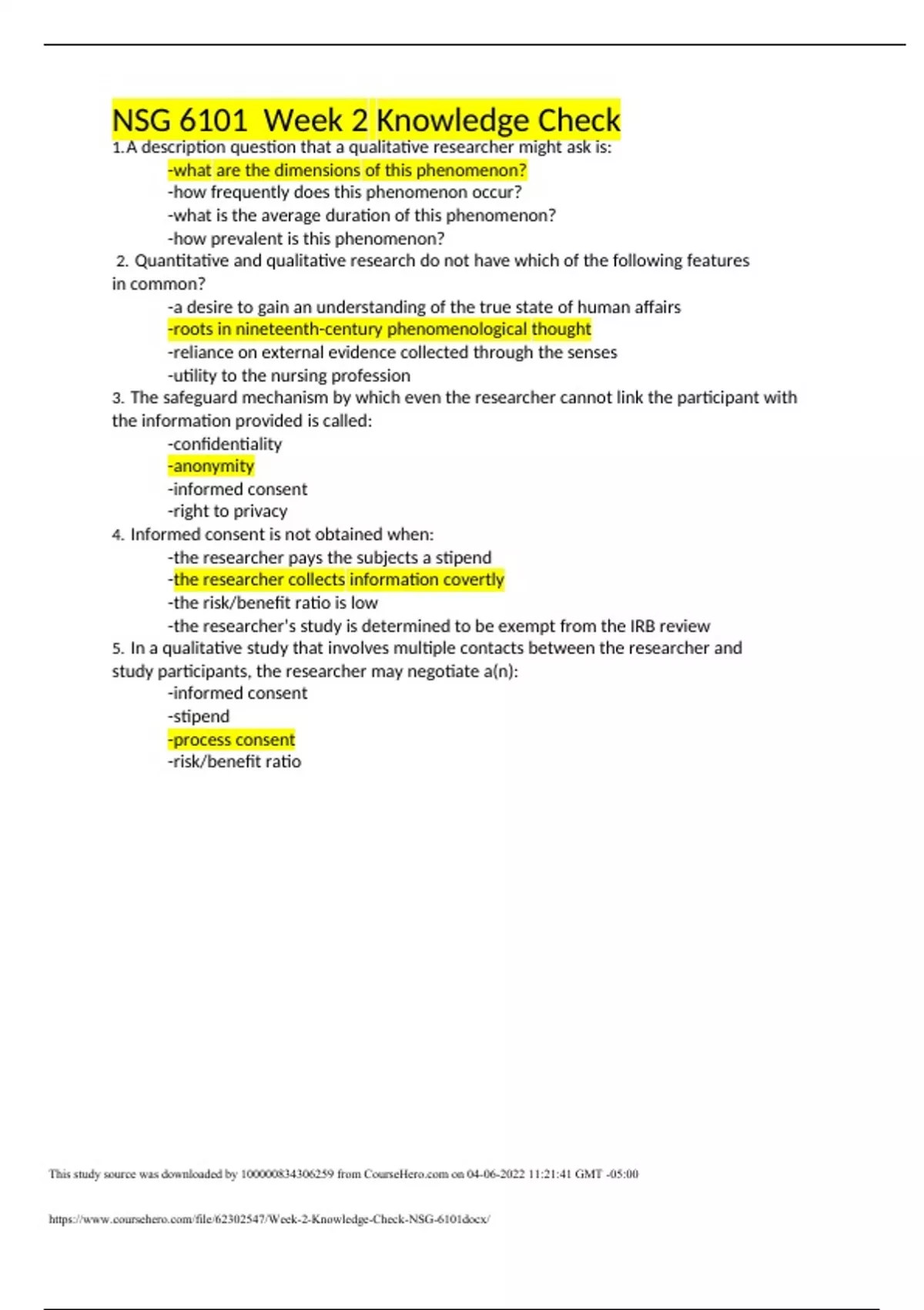 NSG 6101 Week 2 Knowledge Check 1. A description question that a qualitative researcher might ask is: -what are the dimensions of this phenomenon? -how frequently does this phenomenon occur? -what is the average duration of this phenomenon? -how prevalent is this phenomenon?