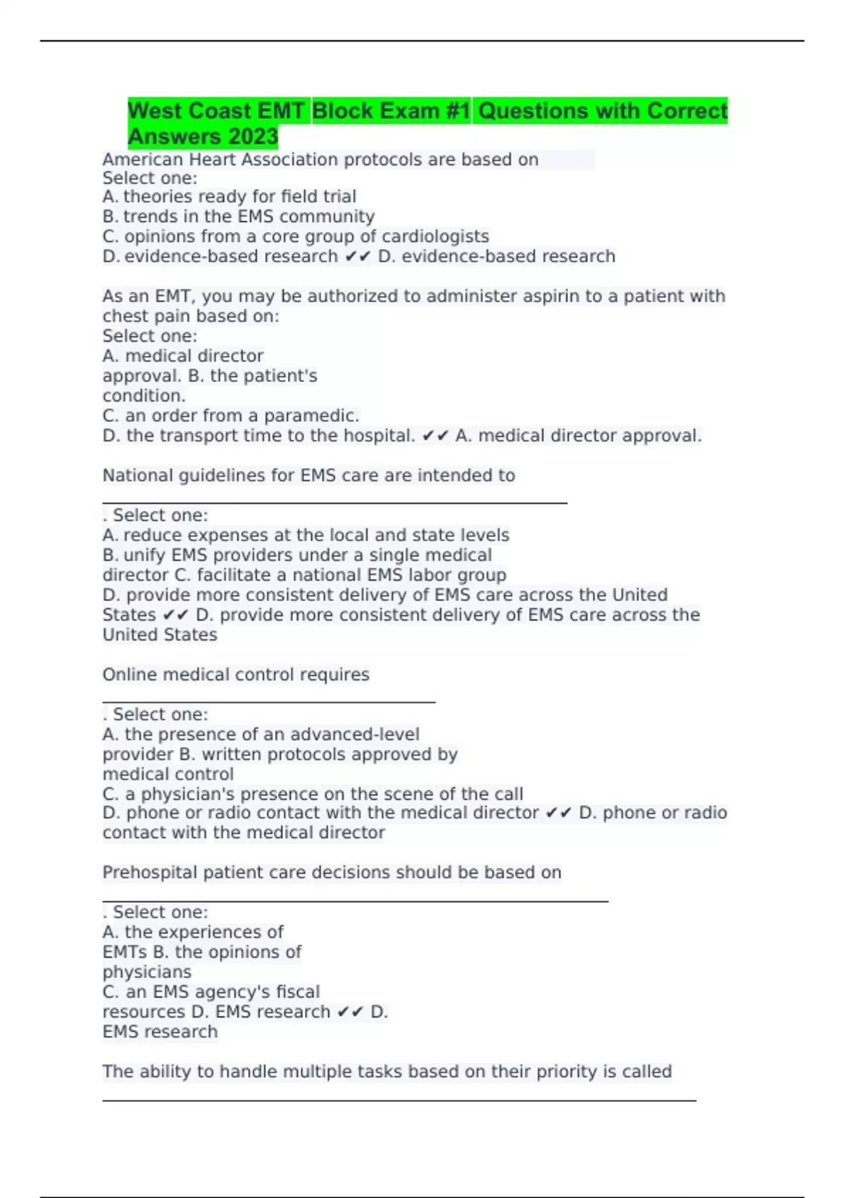 West Coast EMT Block Exam #1 Questions with Correct Answers 2023