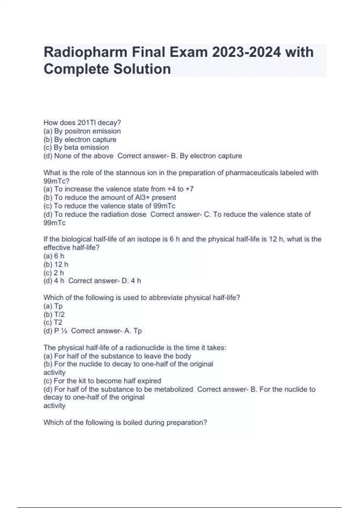 Radiopharm Final Exam with Complete Solution. How does 201Tl decay? (a) By positron emission (b) By electron capture (c) By beta emission (d) None of the above Correct answer- B. By electron capture What is the role of the stannous ion in the preparation of pharmaceuticals labeled with 99mTc? (a) To increase the valence state from +4 to +7 (b) To reduce the amount of Al3+ present (c) To reduce the valence state of 99mTc (d) To reduce the radiation dose Correct answer- C. To reduce the valence state of 99mTc If the biological half-life of an isotope is 6 h and the physical half-life is 12 h, what is the effective half-life? (a) 6 h (b) 12 h (c) 2 h (d) 4 h Correct answer- D. 4 h Which of the following is used to abbreviate physical half-life? (a) Tp (b) T/2 (c) T2 (d) P 1⁄2 Correct answer- A. Tp The physical half-life of a radionuclide is the time it takes: (a) For half of the substance to leave the body (b) For the nuclide to decay to one-half of the original activity (c) For the kit to become half expired (d) For half of the substance to be metabolized Correct answer- B. For the nuclide to decay to one-half of the original activity Which of the following is boiled during preparation? (a) MAA (b) Sulfur colloid (c) Albumin colloid (d) Diphosphonates Correct answer- B. Sulfur colloid The presence of 12 μg Al+3 in 1 ml of 99mTc eluate is: (a) An example of radionuclidic impurity (b) An example of chemical impurity (c) An example of radiochemical impurity (d) Acceptable since it is less than 15 μg/ml Correct answer- B. An example of chemical impurity Which body decides on the acceptable levels of radionuclidic impurity? (a) USP (b) NRC (c) FDA (d) Both (a) and (b) Correct answer- D. Both (a) and (b) NRC, FDA Which of the following is an example of radionuclidic impurity? (a) Presence of free 99mTc in a preparation of 99mTc sulfur colloid (b) Presence of 99Mo in 99mTc eluate (c) Presence of aluminum ions in 99mTc eluate (d) Presence of pyrogens in eluate Correct answer- B. Presence of 99Mo in 99mTc eluate What is the maximum amount of aluminum ions (Al+3) allowed in 1 ml of 99mTc eluate according to the USP? (a) None is allowed (b) 5μg (c) 10μg (d) 15μg Correct answer- C. 10μg What is indicated by the front of an instant thin layer chromatography (ITLC) strip? (a) Radionuclidic impurity. (b) Particles of incorrect size. (c) Pyrogens. (d) This depends on the solvent and strip used. Correct answer- D. This depends on the solvent and strip used. What is the most likely size of an MAA particle if correctly prepared? (a) 0-100 mm (b) 10-30μm (c) 10-30 mm (d) 0-250μm Correct answer- B. 10-30μm .