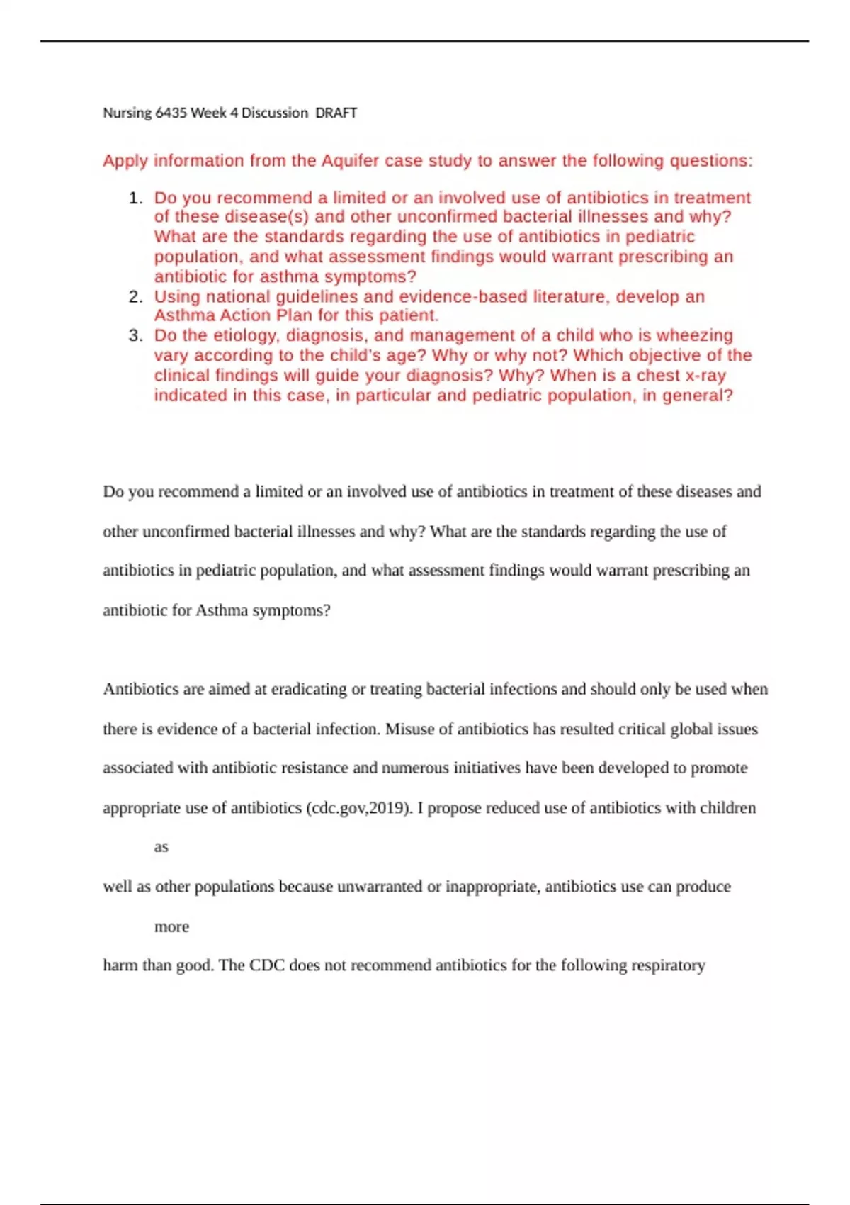 Nursing 6435 Week 4 Discussion DRAFT Apply information from the Aquifer case study to answer the following questions: 1. Do you recommend a limited or an involved use of antibiotics in treatment of these disease(s) and other unconfirmed bacterial illnesses and why? What are the standards regarding the use of antibiotics in pediatric population, and what assessment findings would warrant prescribing an antibiotic for asthma symptoms? 2. Using national guidelines and evidence-based literature, develop an Asthma Action Plan for this patient. 3. Do the etiology, diagnosis, and management of a child who is wheezing vary according to the child’s age? Why or why not? Which objective of the clinical findings will guide your diagnosis? Why? When is a chest x-ray indicated in this case, in particular and pediatric population, in general? Do you recommend a limited or an involved use of antibiotics in treatment of these diseases and other unconfirmed bacterial illnesses and why? What are the standards regarding the use of antibiotics in pediatric population, and what assessment findings would warrant prescribing an antibiotic for Asthma symptoms? Antibiotics are aimed at eradicating or treating bacterial infections and should only be used when there is evidence of a bacterial infection. Misuse of antibiotics has resulted critical global issues associated with antibiotic resistance and numerous initiatives have been developed to promote appropriate use of antibiotics (,2019). I propose reduced use of antibiotics with children as well as other populations because unwarranted or inappropriate, antibiotics use can produce more harm than good. The CDC does not recommend antibiotics for the following respiratory