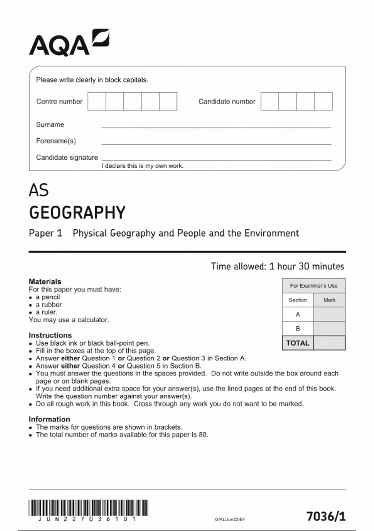 AQA AS GEOGRAPHY PAPER 1 MAY 2022;{70361}{PHYSICAL GEOGRAPHY AND PEOPLE AND THE ENVIROMENT}most reliable for best scores