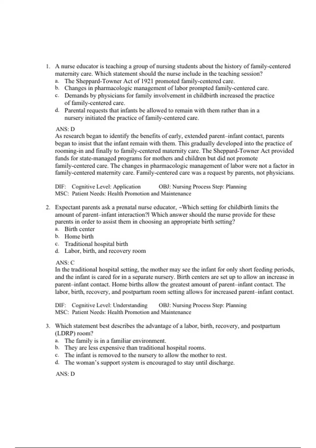 Fundamentals of Nursing 9th Ed. by Patricia Potter et al. 1. A nurse educator is teaching a group of nursing students about the history of family-centered maternity care. Which statement should the nurse include in the teaching session? a. The Sheppard-Towner Act of 1921 promoted family-centered care. b. Changes in pharmacologic management of labor prompted family-centered care. c. Demands by physicians for family involvement in childbirth increased the practice of family-centered care. d. Parental requests that infants be allowed to remain with them rather than in a nursery initiated the practice of family-centered care. ANS: D As research began to identify the benefits of early, extended parent–infant contact, parents began to insist that the infant remain with them. This gradually developed into the practice of rooming-in and finally to family-centered maternity care. The Sheppard-Towner Act provided funds for state-managed programs for mothers and children but did not promote family-centered care. The changes in pharmacologic management of labor were not a factor in family-centered maternity care. Family-centered care was a request by parents, not physicians. DIF: Cognitive Level: Application OBJ: Nursing Process Step: Planning MSC: Patient Needs: Health Promotion and Maintenance 2. Expectant parents ask a prenatal nurse educator, ―Which setting for childbirth limits the amount of parent–infant interaction?‖ Which answer should the nurse provide for these parents in order to assist them in choosing an appropriate birth setting? a. Birth center b. Home birth c. Traditional hospital birth d. Labor, birth, and recovery room ANS: C In the traditional hospital setting, the mother may see the infant for only short feeding periods, and the infant is cared for in a separate nursery. Birth centers are set up to allow an increase in parent–infant contact. Home births allow the greatest amount of parent–infant contact. The labor, birth, recovery, and postpartum room setting allows for increased parent–infant contact. DIF: Cognitive Level: Understanding OBJ: Nursing Process Step: Planning MSC: Patient Needs: Health Promotion and Maintenance 3. Which statement best describes the advantage of a labor, birth, recovery, and postpartum (LDRP) room? a. The family is in a familiar environment. b. They are less expensive than traditional hospital rooms. c. The infant is removed to the nursery to allow the mother to rest. d. The woman’s support system is encouraged to stay until discharge. ANS: D Sleeping equipment is provided in a private room. A hospital setting is never a familiar environment to new parents. An LDRP room is not less expensive than a traditional hospital room. The baby remains with the mother at all times and is not removed to the nursery for routine care or testing. The father or other designated members of the mother’s support system are encouraged to stay at all times. DIF: Cognitive Level: Understanding OBJ: Nursing Process Step: Assessment MSC: Patient Needs: Health Promotion and Maintenance 4. Which nursing intervention is an independent function of the professional nurse? a. Administering oral analgesics b. Requesting diagnostic studies c. Teaching the patient perineal care d. Providing wound care to a surgical incision ANS: C Nurses are now responsible for various independent functions, including teaching, counseling, and intervening in nonmedical problems. Interventions initiated by the physician and carried out by the nurse are called dependent functions. Administrating oral analgesics is a dependent function; it is initiated by a physician and carried out by a nurse. Requesting diagnostic studies is a dependent function. Providing wound care is a dependent function; however, the physician prescribes the type of wound care through direct orders or protocol. DIF: Cognitive Level: Understanding OBJ: Nursing Process Step: Assessment MSC: Patient Needs: Safe and Effective Care Environment 5. Which response by the nurse is the most therapeutic when the patient states, ―I’m so afraid to have a cesarean birth‖? a. ―Everything will be OK.‖ b. ―Don’t worry about it. It will be over soon.‖ c. ―What concerns you most about a cesarean birth?‖ d. ―The physician will be in later and you can talk to him.‖ ANS: C The response, ―What concerns you most about a cesarean birth‖ focuses on what the patient is saying and asks for clarification, which is the most therapeutic response. The response, ―Everything will be ok‖ is belittling the patient’s feelings. The response, ―Don’t worry about it. It will be over soon‖ will indicate that the patient’s feelings are not important. The response, ―The physician will be in later and you can talk to him‖ does not allow the patient to verbalize her feelings when she wishes to do that. DIF: Cognitive Level: Application OBJ: Nursing Process Step: Implementation MSC: Patient Needs: Psychosocial Integrity 6. In which step of the nursing process does the nurse determine the appropriate interventions for the identified nursing diagnosis? a. Planning b. Evaluation c. Assessment d. Intervention ANS: A