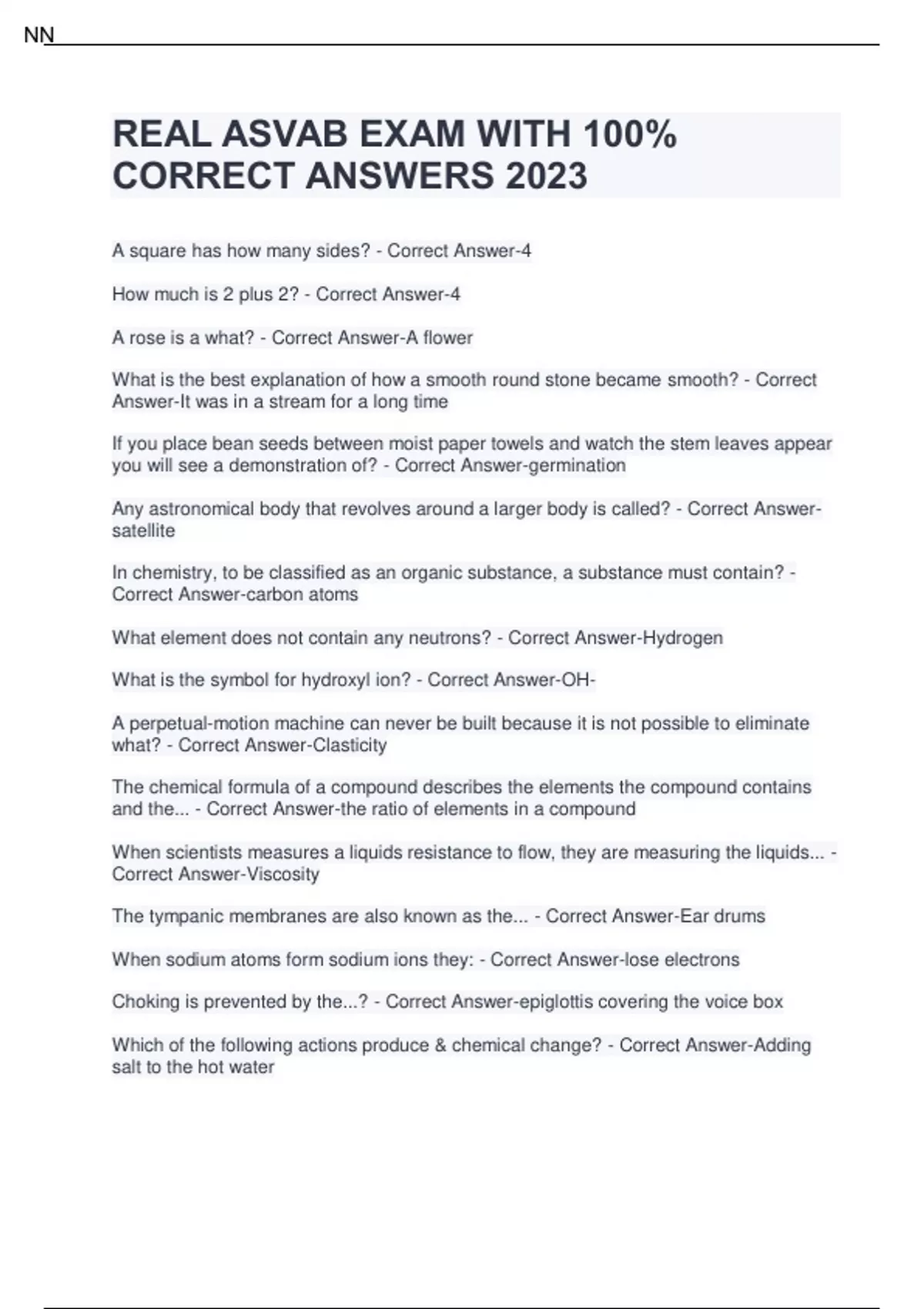 Which of the following is a non-renewable resource? - Correct Answer-Copper What are the 2 main gases that make up stars? - Correct Answer-Hydrogen and helium A radar is designed to report the track of an aircraft every second. If this radar reports 30 tracks in one minute, what percentage of the time did the radar track the aircraft? - Correct Answer-50% Jerry walked a dog from 6:40am to 7:30pm one day. If he was paid at the rate of 6$ per hour, how much did he earn that day? - Correct Answer-$5.00 A women is looking for a bigger square office. She finds an office twice the area of her current office. If the perimeter of her current office is 88 feet, how many square feet is the new office? - Correct Answer-176 sq ft If the perimeter of a square garden is 84 feet, what is the area of the garden? - Correct Answer-441sqft How many feet of chain fence are necessary to enclose a dog pen that is square and has an area of 64sqft - Correct Answer-32 The pet store had 6 puppies selling for $104 each and 12 kittens selling for $24 each. Today, only 2 puppies and 8 kittens we're left. In dollar terms, what was the ratio of sales of puppies and kittens? - Correct Answer-13 to 3 The price of salmon at a fish market is $5.40 per pound. This is 150% of it's cost at a supermarket. How much would it cost per pound at a supermarket? - Correct Answer-$3.60 A train goes twice as fast downhill as it can go uphill, and 2/3 as fast uphill as it can go on level ground. If it goes 120 mph downhill, how long will it take to travel 45 miles on flat land? - Correct Answer-1/2 hour Jamie just bought two boxes. The first box is square, with each side measuring 10 units, and is 4 units high. The second box is rectangular and has twice the volume of the square box. If the height of the second box is 5 units, and the width is 10 units, what is the length of the second box? - Correct Answer-16 units Each August, a restaurant's rent is adjusted to the cost of living index. The rent has been 1,550 a month, and the cost of living index for this August was 3.7%. What is the new rent per month? - Correct Answer-$1,607.35 There are 9 red and 6 green marbles in a bag. A child reaches in the bag and randomly takes one marble. What is the probability pf that child getting a green marble? - Correct Answer-.66