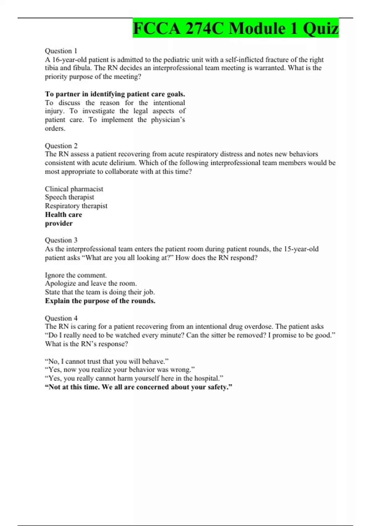 Question 1 A 16-year-old patient is admitted to the pediatric unit with a self-inflicted fracture of the right tibia and fibula. The RN decides an interprofessional team meeting is warranted. What is the priority purpose of the meeting? To partner in identifying patient care goals. To discuss the reason for the intentional injury. To investigate the legal aspects of patient care. To implement the physician’s orders. Question 2 The RN assess a patient recovering from acute respiratory distress and notes new behaviors consistent with acute delirium. Which of the following interprofessional team members would be most appropriate to collaborate with at this time? Clinical pharmacist Speech therapist Respiratory therapist Health care provider Question 3 As the interprofessional team enters the patient room during patient rounds, the 15-year-old patient asks “What are you all looking at?” How does the RN respond? Ignore the comment. Apologize and leave the room. State that the team is doing their job. Explain the purpose of the rounds.