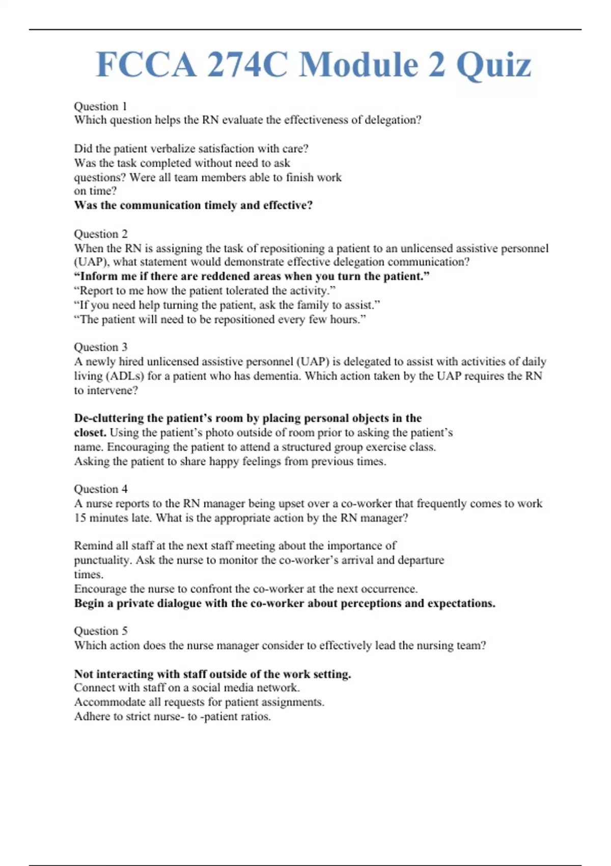 Question 1 Which question helps the RN evaluate the effectiveness of delegation? Did the patient verbalize satisfaction with care? Was the task completed without need to ask questions? Were all team members able to finish work on time? Was the communication timely and effective? Question 2 When the RN is assigning the task of repositioning a patient to an unlicensed assistive personnel (UAP), what statement would demonstrate effective delegation communication? “Inform me if there are reddened areas when you turn the patient.” “Report to me how the patient tolerated the activity.” “If you need help turning the patient, ask the family to assist.” “The patient will need to be repositioned every few hours.” Question 3 A newly hired unlicensed assistive personnel (UAP) is delegated to assist with activities of daily living (ADLs) for a patient who has dementia. Which action taken by the UAP requires the RN to intervene? De-cluttering the patient’s room by placing personal objects in the closet. Using the patient’s photo outside of room prior to asking the patient’s name. Encouraging the patient to attend a structured group exercise class. Asking the patient to share happy feelings from previous times.