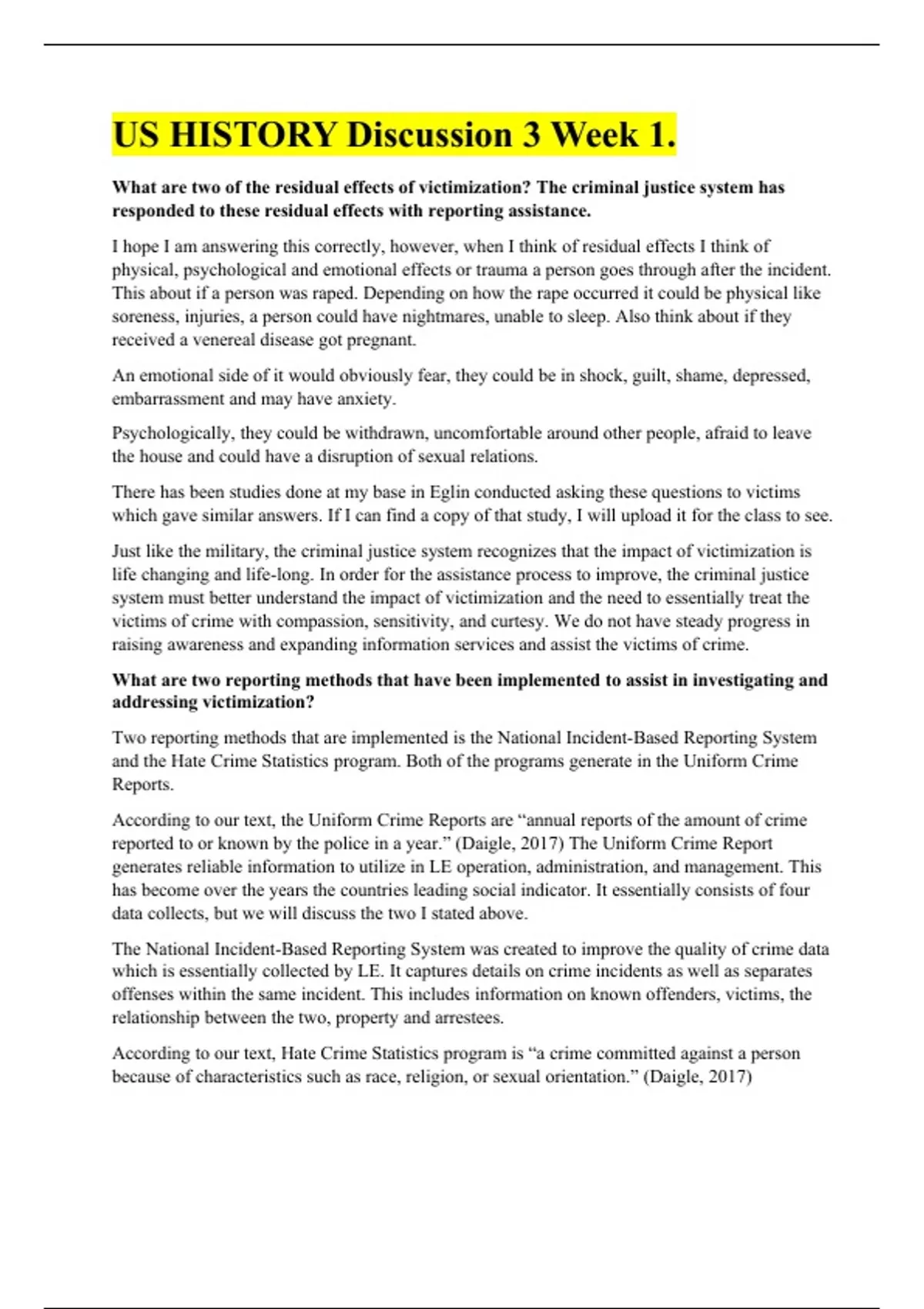 US HISTORY Discussion 3 Week 1. What are two of the residual effects of victimization? The criminal justice system has responded to these residual effects with reporting assistance. I hope I am answering this correctly, however, when I think of residual effects I think of physical, psychological and emotional effects or trauma a person goes through after the incident. This about if a person was raped. Depending on how the rape occurred it could be physical like soreness, injuries, a person could have nightmares, unable to sleep. Also think about if they received a venereal disease got pregnant. An emotional side of it would obviously fear, they could be in shock, guilt, shame, depressed, embarrassment and may have anxiety. Psychologically, they could be withdrawn, uncomfortable around other people, afraid to leave the house and could have a disruption of sexual relations. There has been studies done at my base in Eglin conducted asking these questions to victims which gave similar answers. If I can find a copy of that study, I will upload it for the class to see. Just like the military, the criminal justice system recognizes that the impact of victimization is life changing and life-long. In order for the assistance process to improve, the criminal justice system must better understand the impact of victimization and the need to essentially treat the victims of crime with compassion, sensitivity, and curtesy. We do not have steady progress in raising awareness and expanding information services and assist the victims of crime. What are two reporting methods that have been implemented to assist in investigating and addressing victimization? Two reporting methods that are implemented is the National Incident-Based Reporting System and the Hate Crime Statistics program. Both of the programs generate in the Uniform Crime Reports. According to our text, the Uniform Crime Reports are “annual reports of the amount of crime reported to or known by the police in a year.” (Daigle, 2017) The Uniform Crime Report generates reliable information to utilize in LE operation, administration, and management. This has become over the years the countries leading social indicator. It essentially consists of four data collects, but we will discuss the two I stated above. The National Incident-Based Reporting System was created to improve the quality of crime data which is essentially collected by LE. It captures details on crime incidents as well as separates offenses within the same incident. This includes information on known offenders, victims, the relationship between the two, property and arrestees. According to our text, Hate Crime Statistics program is “a crime committed against a person because of characteristics such as race, religion, or sexual orientation.” (Daigle, 2017) Are the reporting methods you discussed effective? If so, why? If not, why not? As a cop, I definitely feel the NIBRS system is effective. It definitely helps us maximize our resources. It allows us to have precise information which shows the when and where crime has occurred. It also displays who the victims and perpetrators are, the types of crimes. This allows up to optimize the use of our resources to fight crime most effectively. Dealing with Hate Crime Statistics program, I don’t think it is effective. We have so many hate crimes each year that never get reported. It is actually quite rare in the military, however, when surveys are conducted we have way more people who state that a hate crime has happened to them. I think another thing that makes this ineffective is classifying murder a murder instead of a hate crime when it is actually a hate crime. What could be done to remedy ineffective reporting methods? One way is to get the community to understand that it is salient to report these crimes in order to get a more accurate number. Also, a lot of times crimes which are hate crime occur, we need to classify them as hate crimes. If we don’t designate it as a hate crime, it essentially minimizes the shocking nature of these crimes which often are more vicious than other assaults. Explain what could be done to create a holistic plan for victim restitution. According to our text, restitution is “restitution is the act of restoring someone to a position he or she would have been in without the wrongdoing.” (Davis, Lurigio & Herman, 2013) Restitution is a touchy subject. I know that some states require judges to order offenders to pay restitution no matter if they can pay it or not. Some states actually consider whether or not depending on if they person can pay if they will give restitution. I think we need to co