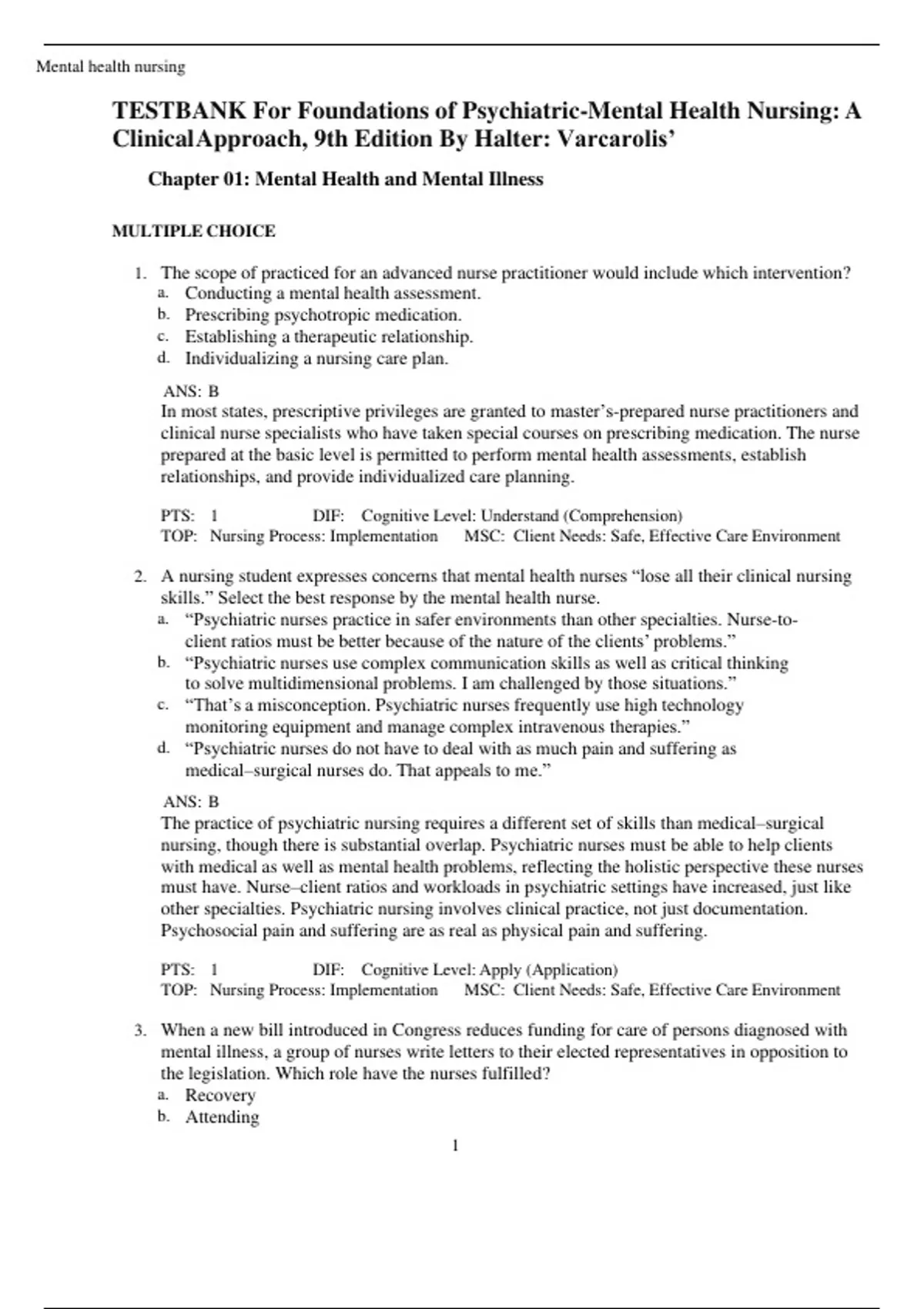 TESTBANK For Foundations of Psychiatric-Mental Health Nursing: A Clinical Approach, 9th Edition By Halter: Varcarolis’ Chapter 01: Mental Health and Mental Illness MULTIPLE CHOICE 1. The scope of practiced for an advanced nurse practitioner would include which intervention? a. Conducting a mental health assessment. b. Prescribing psychotropic medication. c. Establishing a therapeutic relationship. d. Individualizing a nursing care plan. ANS: B In most states, prescriptive privileges are granted to master’s-prepared nurse practitioners and clinical nurse specialists who have taken special courses on prescribing medication. The nurse prepared at the basic level is permitted to perform mental health assessments, establish relationships, and provide individualized care planning. PTS: 1 DIF: Cognitive Level: Understand (Comprehension) TOP: Nursing Process: Implementation MSC: Client Needs: Safe, Effective Care Environment 2. A nursing student expresses concerns that mental health nurses “lose all their clinical nursing skills.” Select the best response by the mental health nurse. a. “Psychiatric nurses practice in safer environments than other specialties. Nurse-to- client ratios must be better because of the nature of the clients’ problems.” b. “Psychiatric nurses use complex communication skills as well as critical thinking to solve multidimensional problems. I am challenged by those situations.” c. “That’s a misconception. Psychiatric nurses frequently use high technology monitoring equipment and manage complex intravenous therapies.” d. “Psychiatric nurses do not have to deal with as much pain and suffering as medical–surgical nurses do. That appeals to me.” ANS: B The practice of psychiatric nursing requires a different set of skills than medical–surgical nursing, though there is substantial overlap. Psychiatric nurses must be able to help clients with medical as well as mental health problems, reflecting the holistic perspective these nurses must have. Nurse–client ratios and workloads in psychiatric settings have increased, just like other specialties. Psychiatric nursing involves clinical practice, not just documentation. Psychosocial pain and suffering are as real as physical pain and suffering. PTS: 1 DIF: Cognitive Level: Apply (Application) TOP: Nursing Process: Implementation MSC: Client Needs: Safe, Effective Care Environment 3. When a new bill introduced in Congress reduces funding for care of persons diagnosed with mental illness, a group of nurses write letters to their elected representatives in opposition to the legislation. Which role have the nurses fulfilled? a. Recovery b. Attending c. Advocacy d. Evidence-based practice ANS: C An advocate defends or asserts another’s cause, particularly when the other person lacks the ability to do that for self. Examples of individual advocacy include helping clients understand their rights or make decisions. On a community scale, advocacy includes political activity, public speaking, and publication in the interest of improving the human condition. Since funding is necessary to deliver quality programming for persons with mental illness, the letter- writing campaign advocates for that cause on behalf of clients who are unable to articulate their own needs. PTS: 1 DIF: Cognitive Level: Understand (Comprehension) TOP: Nursing Process: Evaluation MSC: Client Needs: Safe, Effective Care Environment 4. A family has a long history of conflicted relationships among the members. Which family member’s comment best reflects a mentally healthy perspective? a. “I’ve made mistakes but everyone else in this family has also.” b. “I remember joy and mutual respect from our early years together.” c. “I will make some changes in my behavior for the good of the family.” d. “It’s best for me to move away from my family. Things will never change.” ANS: C The correct response demonstrates the best evidence of a healthy recognition of the importance of relationships. Mental health includes rational thinking, communication skills, learning, emotional growth, resilience, and self-esteem. Recalling joy from earlier in life may be healthy, but the correct response shows a higher level of mental health. The other incorrect responses show blaming and avoidance. PTS: 1 DIF: Cognitive Level: Analyze (Analysis) TOP: Nursing Process: Assessment MSC: Client Needs: Psychosocial Integrity 5. Which assessment finding most clearly indicates that a client may be experiencing a mental illness? a. reporting occasional sleeplessness and anxiety. b. reporting a consistently sad, discouraged, and hopeless mood. c. being able to describe the difference between “as if” and “for real.” d. experiencing difficulty making a decision about whether to change jobs. ANS: B The correct response describes a mood alteration, which reflects mental illness. The distracters describe behaviors that are mentally healthy or within the usual scope of human experience. PTS: 1 DIF: Cognitive Level: Apply (Application) TOP: Nursing Process: Assessment MSC: Client Needs: Psychosocial Integrity 6. Which finding best indicates that the goal “Demonstrate mentally healthy behavior” was achieved for an adult client? a. being willing to work towards achieving ideals and meeting demands. b. behaving without considering the consequences of personal actions. c. aggressively meeting personal needs without considering the rights of others. d. seeking help from others to avoid assuming responsibility for major areas of own life. ANS: A Mental health is a state of well-being in which individuals reach their own potential, cope with the normal stresses of life, work productively, and contribute to the community. Mental health provides people with the capacity for rational thinking, communication skills, learning, emotional growth, resilience, and self-esteem. The correct response describes an adaptive, healthy behavior. The distracters describe 