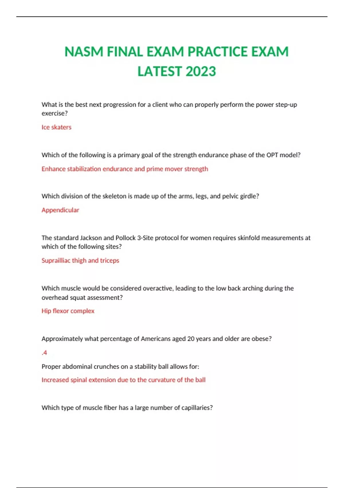NASM FINAL EXAM PRACTICE EXAM LATEST 2023 What is the best next progression for a client who can properly perform the power step-up exercise? Ice skaters Which of the following is a primary goal of the strength endurance phase of the OPT model? Enhance stabilization endurance and prime mover strength Which division of the skeleton is made up of the arms, legs, and pelvic girdle? Appendicular