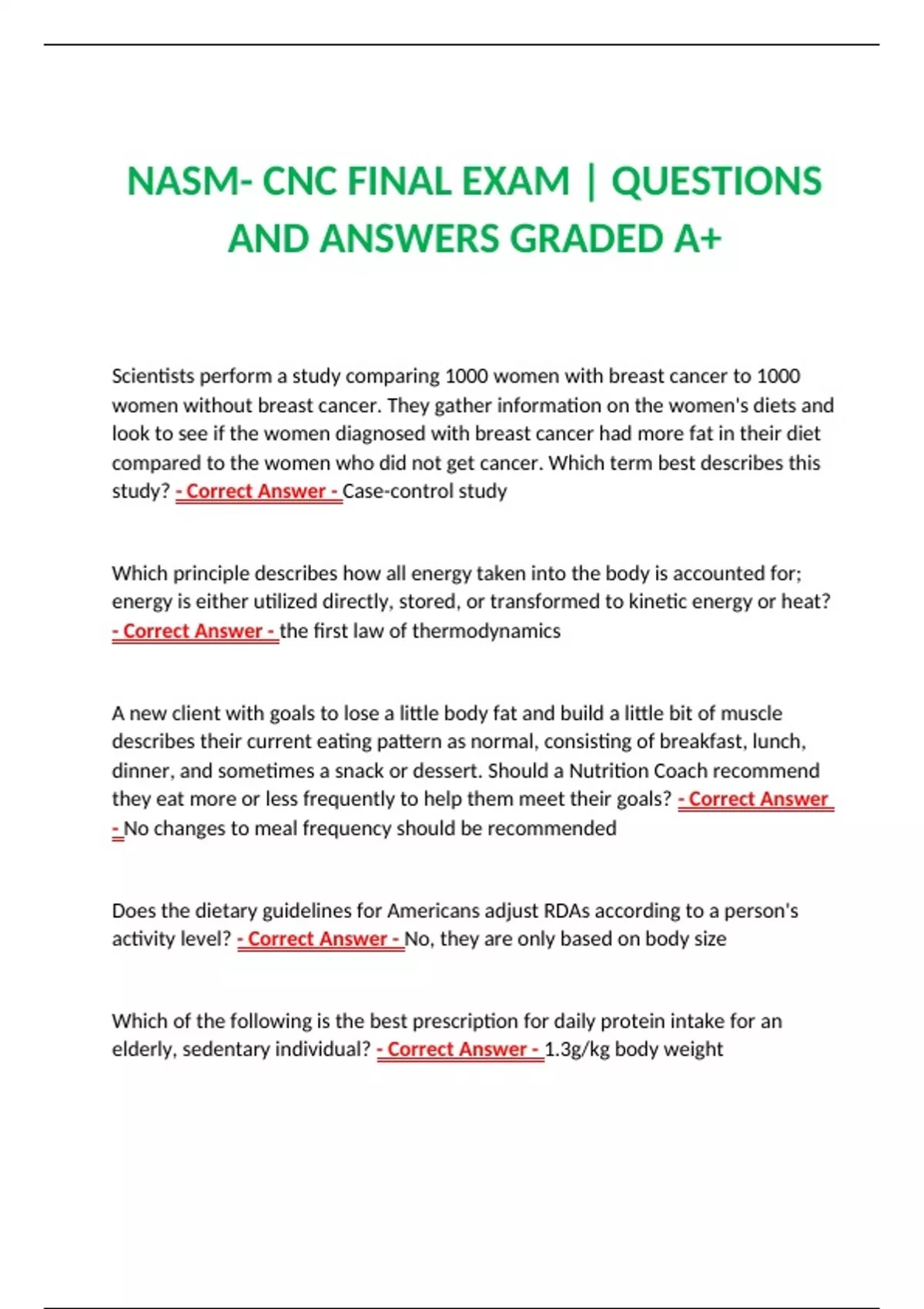 NASM- CNC FINAL EXAM | QUESTIONS AND ANSWERS GRADED A+ Scientists perform a study comparing 1000 women with breast cancer to 1000 women without breast cancer. They gather information on the women's diets and look to see if the women diagnosed with breast cancer had more fat in their diet compared to the women who did not get cancer. Which term best describes this study? - Correct Answer - Case-control study