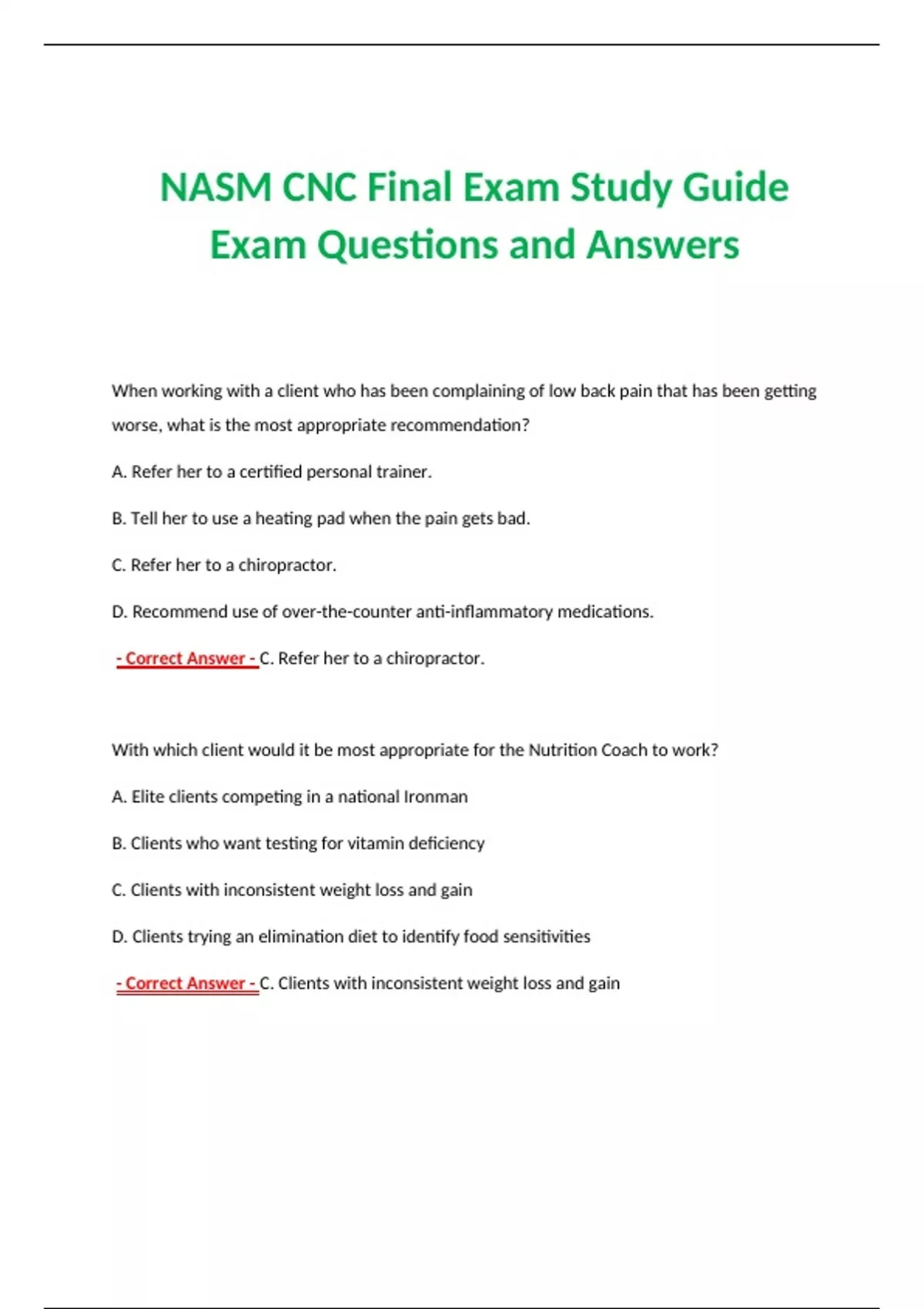 NASM CNC Final Exam Study Guide Exam Questions and Answers When working with a client who has been complaining of low back pain that has been getting worse, what is the most appropriate recommendation? A. Refer her to a certified personal trainer. B. Tell her to use a heating pad when the pain gets bad. C. Refer her to a chiropractor. D. Recommend use of over-the-counter anti-inflammatory medications. - Correct Answer - C. Refer her to a chiropractor. With which client would it be most appropriate for the Nutrition Coach to work? A. Elite clients competing in a national Ironman B. Clients who want testing for vitamin deficiency C. Clients with inconsistent weight loss and gain D. Clients trying an elimination diet to identify food sensitivities - Correct Answer - C. Clients with inconsistent weight loss and gain According to the scope of practice for a Nutrition Coach, which is an example of an appropriate resource for determining daily caloric intake? A. ADA calculations based on age, gender, and activity level B. Body type and cultural preferences C. Dietary Guidelines for Americans D. The Nutrition Coach cannot assist with daily caloric intake. - Correct Answer - C. Dietary Guidelines for Americans