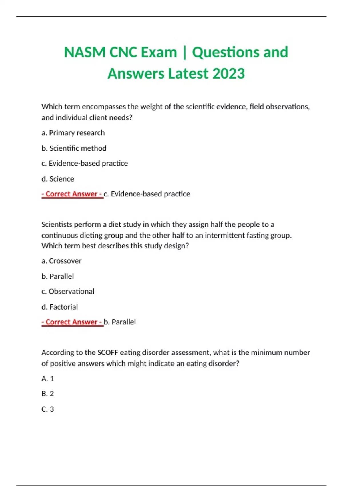 NASM CNC Exam | Questions and Answers Latest 2023 Which term encompasses the weight of the scientific evidence, field observations, and individual client needs? a. Primary research b. Scientific method c. Evidence-based practice d. Science - Correct Answer - c. Evidence-based practice Scientists perform a diet study in which they assign half the people to a continuous dieting group and the other half to an intermittent fasting group. Which term best describes this study design? a. Crossover b. Parallel c. Observational d. Factorial - Correct Answer - b. Parallel According to the SCOFF eating disorder assessment, what is the minimum number of positive answers which might indicate an eating disorder? A. 1 B. 2 C. 3 D. 5 - Correct Answer - B. 2
