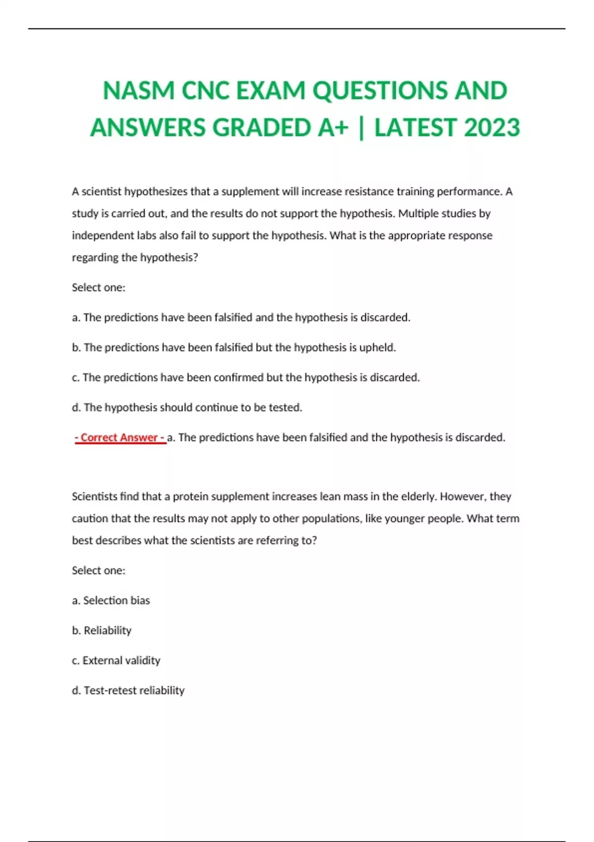 NASM CNC EXAM QUESTIONS AND ANSWERS GRADED A+ | LATEST 2023 A scientist hypothesizes that a supplement will increase resistance training performance. A study is carried out, and the results do not support the hypothesis. Multiple studies by independent labs also fail to support the hypothesis. What is the appropriate response regarding the hypothesis? Select one: a. The predictions have been falsified and the hypothesis is discarded. b. The predictions have been falsified but the hypothesis is upheld. c. The predictions have been confirmed but the hypothesis is discarded. d. The hypothesis should continue to be tested. - Correct Answer - a. The predictions have been falsified and the hypothesis is discarded. Scientists find that a protein supplement increases lean mass in the elderly. However, they caution that the results may not apply to other populations, like younger people. What term best describes what the scientists are referring to? Select one: a. Selection bias b. Reliability c. External validity d. Test-retest reliability - Correct Answer - c. External validity Which term refers to a proposed explanation for a set of observations? Select one: a. Hypothesis b. Randomized controlled trial c. Theory d. Prediction - Correct Answer - a. Hypothesis