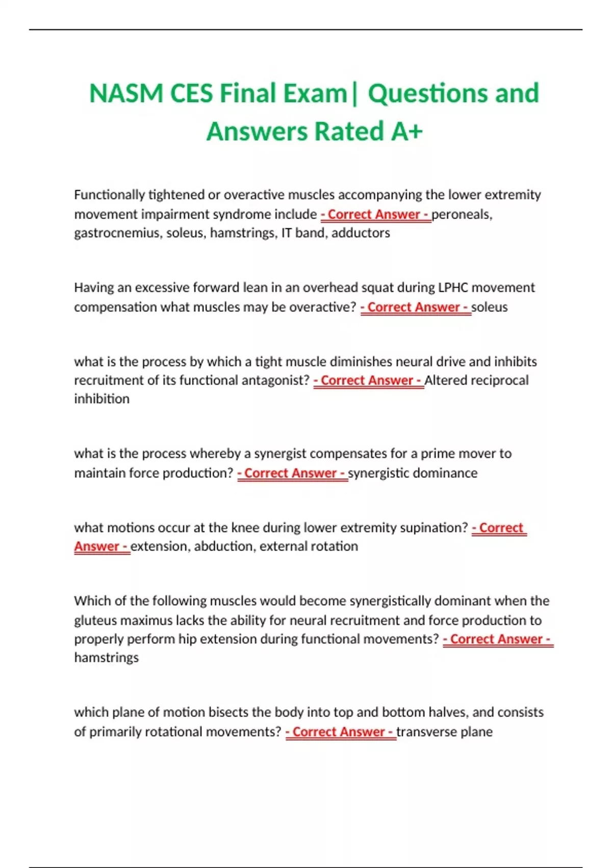 nasm ces final exam| questions and answers rated a functionally tightened or overactive muscles accompanying the lower extremity movement impairment syndrome include correct answer peroneals