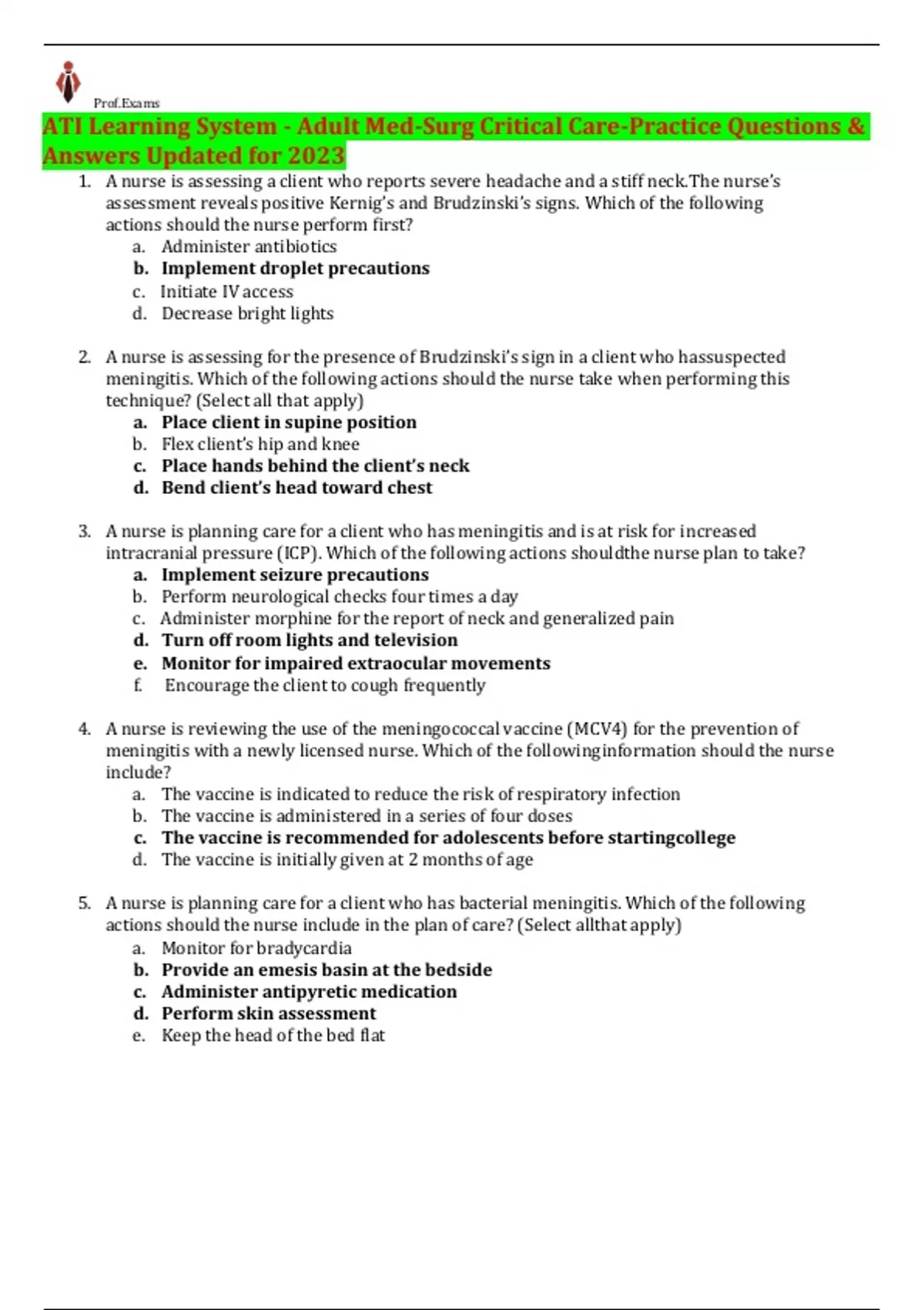 ATI - Adult Med-Surg Critical CarenursingATIcriticalcaremedicalsurgicalSOLVED-ATI Learning System - Adult Med-Surg Critical Care-Complete Practice Questions & Answers Updated for 20231. A nurse is assessing a client who reports severe headache and a stiff neck. The nurse’s assessment reveals positive Kernig’s and Brudzinski’s signs. Which of the following actions should the nurse perform first? a. Administer antibiotics b. Implement droplet precautions c. Initiate IV access d. Decrease bright lights 2. A nurse is assessing for the presence of Brudzinski’s sign in a client who has suspected meningitis. Which of the following actions should the nurse take when performing this technique? (Select all that apply) a. Place client in supine position b. Flex client’s hip and knee c. Place hands behind the client’s neck d. Bend client’s head toward chest 3. A nurse is planning care for a client who has meningitis and is at risk for increased intracranial pressure (ICP). Which of the following actions should the nurse plan to take? a. Implement seizure precautions b. Perform neurological checks four times a day c. Administer morphine for the report of neck and generalized pain d. Turn off room lights and television e. Monitor for impaired extraocular movements f. Encourage the client to cough frequently 4. A nurse is reviewing the use of the meningococcal vaccine (MCV4) for the prevention of meningitis with a newly licensed nurse. Which of the following information should the nurse include? a. The vaccine is indicated to reduce the risk of respiratory infection b. The vaccine is administered in a series of four doses c. The vaccine is recommended for adolescents before starting college d. The vaccine is initially given at 2 months of age 5. A nurse is planning care for a client who has bacterial meningitis. Which of the following actions should the nurse include in the plan of care? (Select all that apply) a. Monitor for bradycardia b. Provide an emesis basin at the bedside c. Administer antipyretic medication d. Perform skin assessment e. Keep the head of the bed flat Prof.Exams 1. A nurse is assessing a client who has a seizure disorder. The client reports he thinks he is about to have a seizure. Which of the following actions should the nurse implement? (Select all that apply) a. Provide privacy b. Ease the client to the floor if standing c. Move furniture away from the client d. Loosen the client’s clothing e. Protect the client’s head with padding f. Restrain the client 2. A nurse is caring for a client who just experienced a generalized seizure. Which of the following actions should the nurse perform first? a. Keep the client in a sideHlying position b. Document the duration of the seizure c. Reorient the client to the environment d. Provide client hygiene 3. A nurse is providing discharge instructions to a female client who has a prescription for phenytoin. Which of the following information should the nurse include? a. Consider taking oral contraceptives when on this medication b. Watch for the receding gums when taking the medication c. Take the medication at the same time every day d. Provide a urine sample to determine therapeutic levels of the medication 4. A nurse is reviewing trigger factors that can cause seizures with a client who has a new diagnosis of generalized seizures. Which of the following information should the nurse include in this review? (Select all that apply) a. Avoid overwhelming fatigue b. Remove caffeinated products from the diet c. Limit looking at flashing lights d. Perform aerobic exercise e. Limit episodes of hypoventilation f. Use of aerosol hairspray is recommended 5. A nurse is completing discharge teaching to a client who has seizures and received a vagal nerve stimulator to decrease seizure activity. Which of the following statements should the nurse include in the teaching? a. “It is safe to use microwaves that are 1,200 watts or less.” b. “You should avoid the use of CT scans with contrast.” c. “You should place a magnet over the implantable device when you feel an aura occurring.” d. “It is recommended that you use ultrasound diathermy for pain management.” Prof.Exams 1. A nurse is caring for a client who displays signs of stage III Parkinson’s disease. Which of the following should the nurse include in the plan of care? a. Recommend a community support group b. Integrate a daily exercise routine c. Provide a walker for ambulation d. Perform ADLs for the client 2. A nurse is developing a plan of care for the nutritional needs of a client who has stage IV Parkinson’s disease. Which actions should the nurse include in the plan of care? (Select all that apply) a. Provide three large balanced meals daily b. Record diet and fluid intake daily c. Document weight every other weak d. Place the client in Fowler’s position to eat e. Offer nutritional supplements between meals 3. A nurse is reinforcing teaching with a client who has Parkinson’s disease and has a new prescription from bromocriptine. Which of the following instructions should the nurse include in the teaching? a. Rise slowly when standing b. Expect urine to become dark_colored c. Avoid foods containing tyramine d. Report any skin discoloration 4. A nurse is assessing a client for manifestations of Parkinson’s disease. Which of the following are expected findings? (Select all that apply) a. Decreased vision b. PillHrolling tremor of the fingers c. Shuffling gait d. Drooling e. Bilateral ankle edema f. Lack of peripheral expression 5. A nurse is caring for a client who has Parkinson’s disease and is starting to display bradykinesia. Which of the following is an appropriate action by the nurse? a. Teach the client to walk more quickly when ambulating b. Complete passive range_of_motion exercises daily c. Place the client on a low_protein, low_calorie diet d. Give the client extra time to perform activities Side Note: Bradykinesia is abnormally slowed moveme