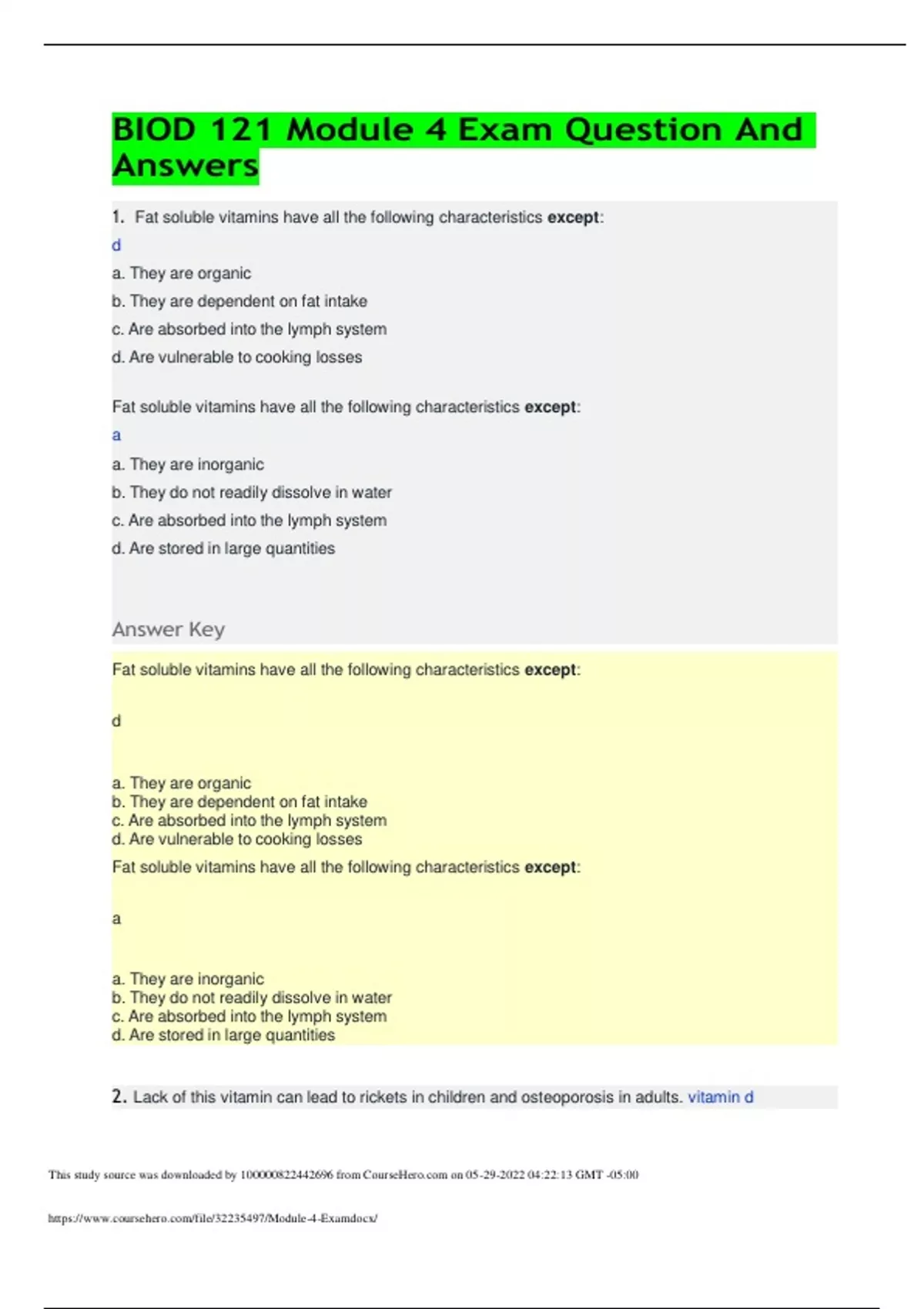 biod 121 module 4 exam question and answers 2 lack of this vitamin can lead to rickets in children and osteoporosis in adults vitamin d 1 fat soluble vitamins