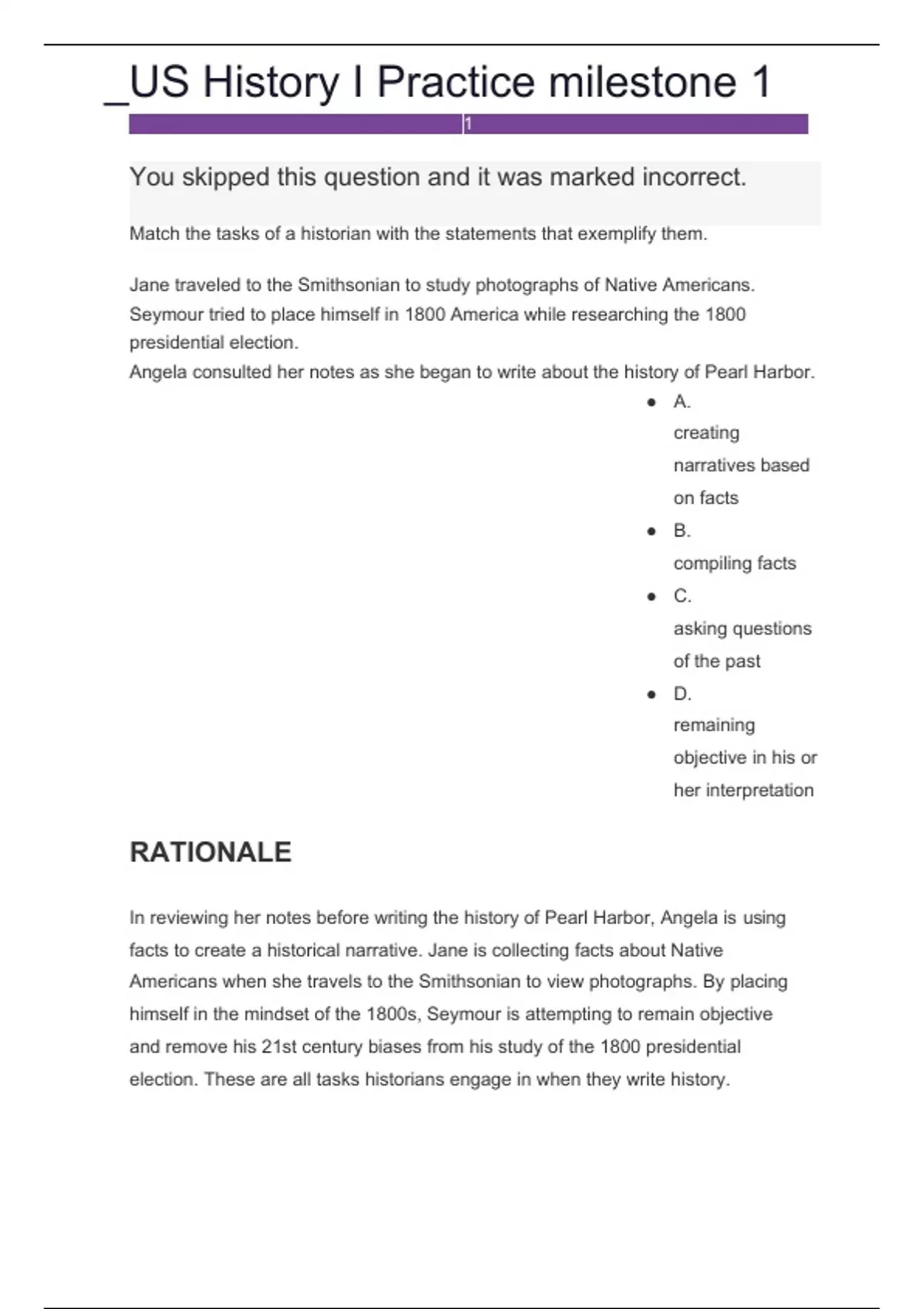 Match the tasks of a historian with the statements that exemplify them. Jane traveled to the Smithsonian to study photographs of Native Americans. Seymour tried to place himself in 1800 America while researching the 1800 presidential election. Angela consulted her notes as she began to write about the history of Pearl Harbor. ● A. creating narratives based on facts ● B. compiling facts ● C. asking questions of the past ● D. remaining objective in his or her interpretation RATIONALE In reviewing her notes before writing the history of Pearl Harbor, Angela is using facts to create a historical narrative. Jane is collecting facts about Native Americans when she travels to the Smithsonian to view photographs. By placing himself in the mindset of the 1800s, Seymour is attempting to remain objective and remove his 21st century biases from his study of the 1800 presidential election. These are all tasks historians engage in when they write history. CONCEPT The Historian's Practice 2 Match the Colony with the statement that describes it. Massachusetts Jamestown ● A. settlement sponsored by a private company for economic gain ● B. England promised 50 acres of free land to all who settled here. ● C. colonists included men, women, and children who did not intend to return to England RATIONALE Recall that the Jamestown Colony was established by the Virginia Company of London, a joint-stock company. Investors in the company hoped to find gold or silver, or other potentially valuable natural resources. As a result, most settlers to Jamestown were men and boys. On the other hand, Massachusetts was settled by Puritan families, including men, women, and children, who were seeking freedom to practice their religion without state interference. CONCEPT Think About It: How Did the Experience of the English Settlers Differ? 3 Stone tools found in Canada may be evidence that humans migrated to North America much earlier than previously believed. A historian might use this example of (A) to interpret prehistoric events. A the European perspective oral history the Native American perspective archaeological evidence RATIONALE