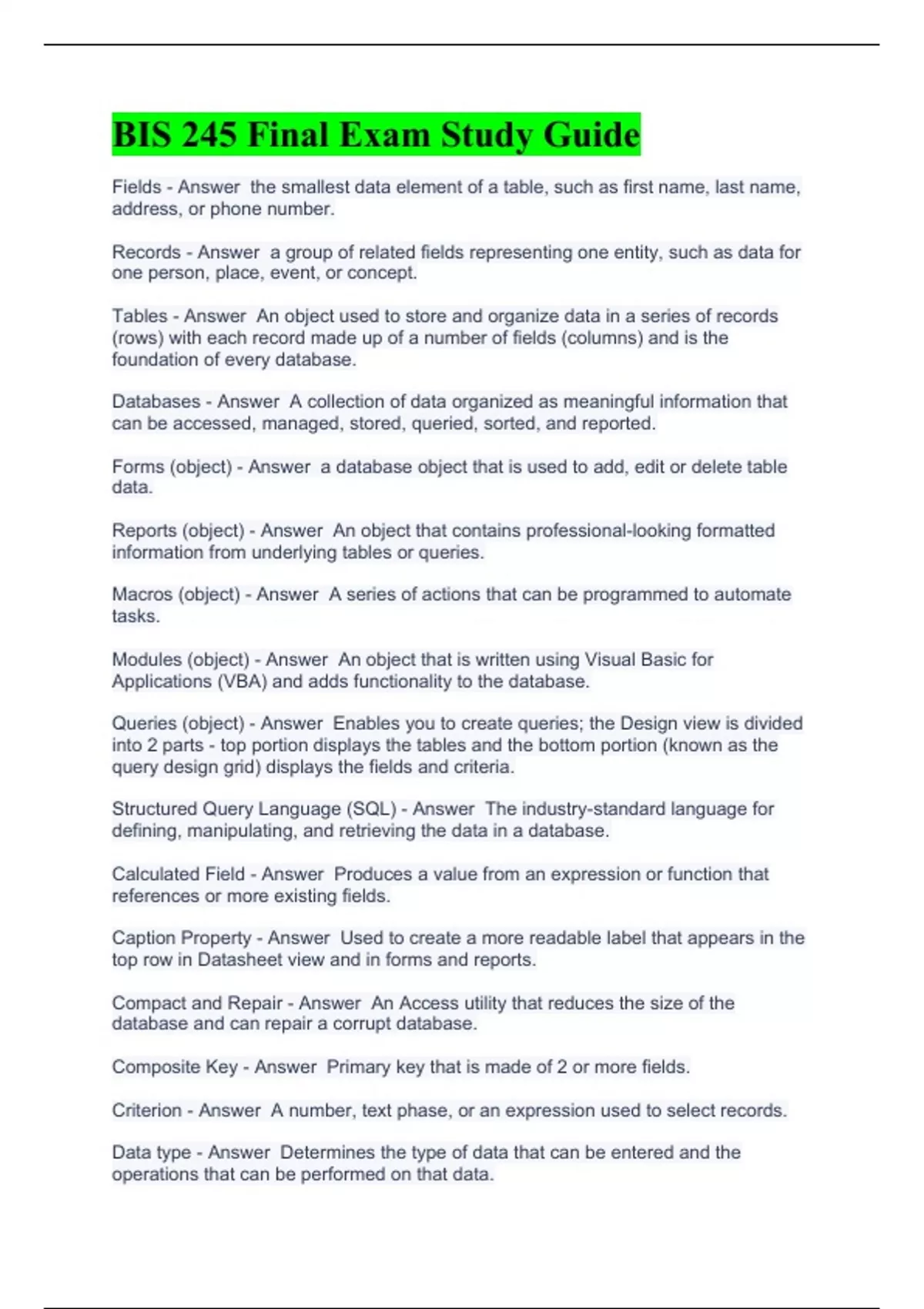 BIS 245 Final Exam Study Guide Fields - Answer the smallest data element of a table, such as first name, last name, address, or phone number. Records - Answer a group of related fields representing one entity, such as data for one person, place, event, or concept. Tables - Answer An object used to store and organize data in a series of records (rows) with each record made up of a number of fields (columns) and is the foundation of every database. Databases - Answer A collection of data organized as meaningful information that can be accessed, managed, stored, queried, sorted, and reported. Forms (object) - Answer a database object that is used to add, edit or delete table data. Reports (object) - Answer An object that contains professional-looking formatted information from underlying tables or queries. Macros (object) - Answer A series of actions that can be programmed to automate tasks. Modules (object) - Answer An object that is written using Visual Basic for Applications (VBA) and adds functionality to the database. Queries (object) - Answer Enables you to create queries; the Design view is divided into 2 parts - top portion displays the tables and the bottom portion (known as the query design grid) displays the fields and criteria. Structured Query Language (SQL) - Answer The industry-standard language for defining, manipulating, and retrieving the data in a database. Calculated Field - Answer Produces a value from an expression or function that references or more existing fields. Caption Property - Answer Used to create a more readable label that appears in the top row in Datasheet view and in forms and reports. Compact and Repair - Answer An Access utility that reduces the size of the database and can repair a corrupt database. Composite Key - Answer Primary key that is made of 2 or more fields. Criterion - Answer A number, text phase, or an expression used to select records. Data type - Answer Determines the type of data that can be entered and the operations that can be performed on that data.