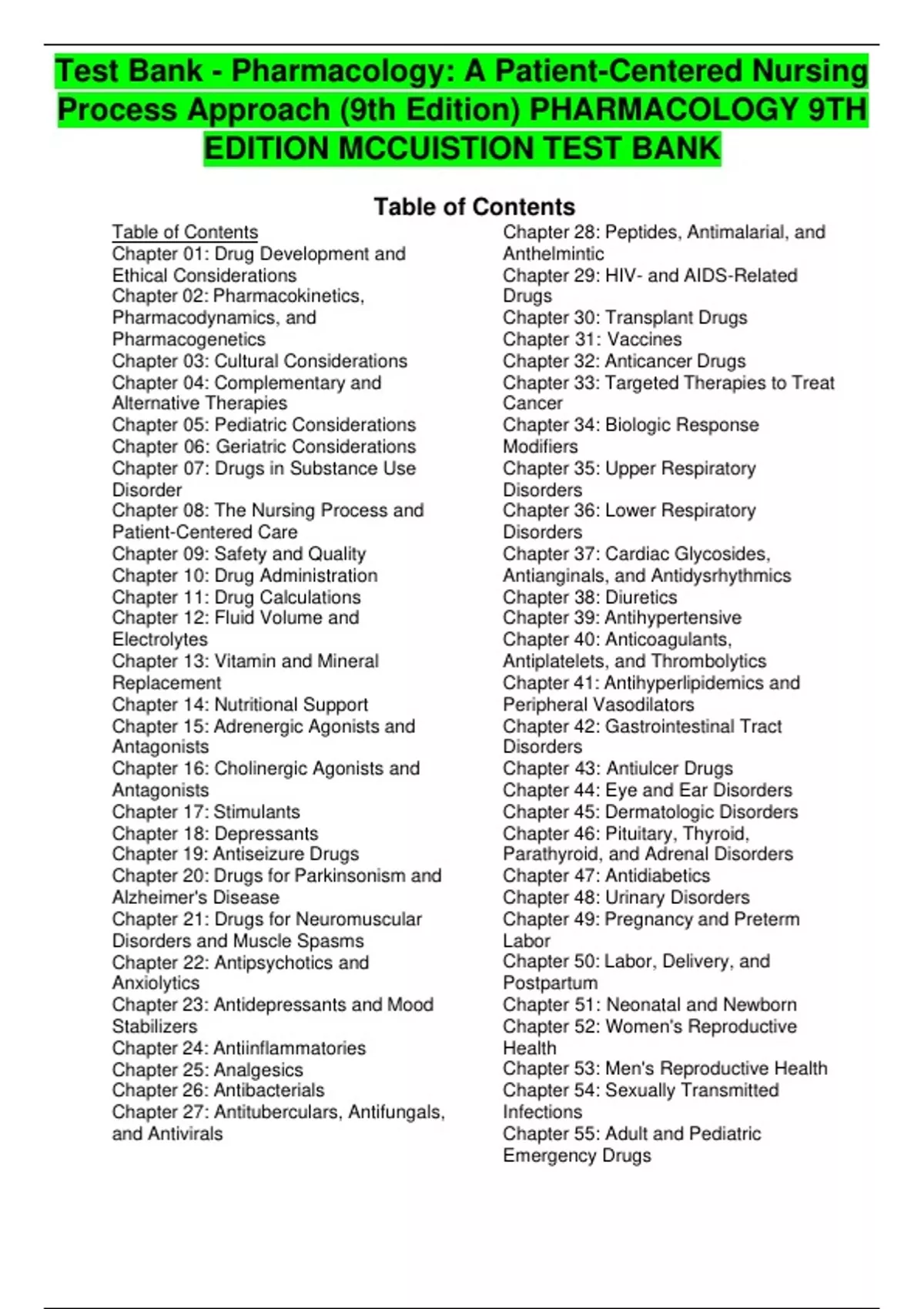 Test Bank - Pharmacology: A Patient-Centered Nursing Process Approach (9th Edition) PHARMACOLOGY 9TH EDITION MCCUISTION TEST BANK Table of Contents Table of Contents Chapter 01: Drug Development and Ethical Considerations Chapter 02: Pharmacokinetics, Pharmacodynamics, and Pharmacogenetics Chapter 03: Cultural Considerations Chapter 04: Complementary and Alternative Therapies Chapter 05: Pediatric Considerations Chapter 06: Geriatric Considerations Chapter 07: Drugs in Substance Use Disorder Chapter 08: The Nursing Process and Patient-Centered Care Chapter 09: Safety and Quality Chapter 10: Drug Administration Chapter 11: Drug Calculations Chapter 12: Fluid Volume and Electrolytes Chapter 13: Vitamin and Mineral Replacement Chapter 14: Nutritional Support Chapter 15: Adrenergic Agonists and Antagonists Chapter 16: Cholinergic Agonists and Antagonists Chapter 17: Stimulants Chapter 18: Depressants Chapter 19: Antiseizure Drugs Chapter 20: Drugs for Parkinsonism and Alzheimer's Disease Chapter 21: Drugs for Neuromuscular Disorders and Muscle Spasms Chapter 22: Antipsychotics and Anxiolytics Chapter 23: Antidepressants and Mood Stabilizers Chapter 24: Antiinflammatories Chapter 25: Analgesics Chapter 26: Antibacterials Chapter 27: Antituberculars, Antifungals, and Antivirals Chapter 28: Peptides, Antimalarial, and Anthelmintic Chapter 29: HIV- and AIDS-Related Drugs Chapter 30: Transplant Drugs Chapter 31: Vaccines Chapter 32: Anticancer Drugs Chapter 33: Targeted Therapies to Treat Cancer Chapter 34: Biologic Response Modifiers Chapter 35: Upper Respiratory Disorders Chapter 36: Lower Respiratory Disorders Chapter 37: Cardiac Glycosides, Antianginals, and Antidysrhythmics Chapter 38: Diuretics Chapter 39: Antihypertensive Chapter 40: Anticoagulants, Antiplatelets, and Thrombolytics Chapter 41: Antihyperlipidemics and Peripheral Vasodilators Chapter 42: Gastrointestinal Tract Disorders Chapter 43: Antiulcer Drugs Chapter 44: Eye and Ear Disorders Chapter 45: Dermatologic Disorders Chapter 46: Pituitary, Thyroid, Parathyroid, and Adrenal Disorders Chapter 47: Antidiabetics Chapter 48: Urinary Disorders Chapter 49: Pregnancy and Preterm Labor Chapter 50: Labor, Delivery, and Postpartum Chapter 51: Neonatal and Newborn Chapter 52: Women's Reproductive Health Chapter 53: Men's Reproductive Health Chapter 54: Sexually Transmitted Infections Chapter 55: Adult and Pediatric Emergency Drugs