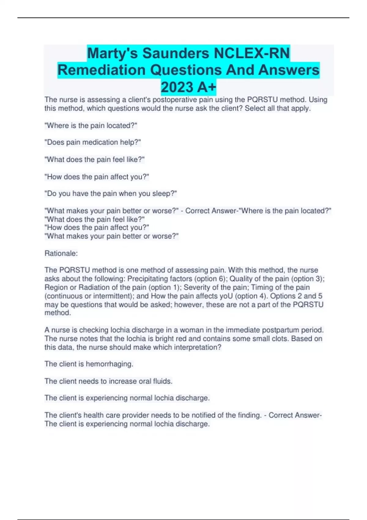 Marty's Saunders NCLEX-RN Remediation Questions And Answers 2023 A+ The nurse is assessing a client's postoperative pain using the PQRSTU method. Using this method, which questions would the nurse ask the client? Select all that apply. "Where is the pain located?" "Does pain medication help?" "What does the pain feel like?" "How does the pain affect you?" "Do you have the pain when you sleep?" "What makes your pain better or worse?" - Correct Answer-"Where is the pain located?" "What does the pain feel like?" "How does the pain affect you?" "What makes your pain better or worse?" Rationale: The PQRSTU method is one method of assessing pain. With this method, the nurse asks about the following: Precipitating factors (option 6); Quality of the pain (option 3); Region or Radiation of the pain (option 1); Severity of the pain; Timing of the pain (continuous or intermittent); and How the pain affects yoU (option 4). Options 2 and 5 may be questions that would be asked; however, these are not a part of the PQRSTU method. A nurse is checking lochia discharge in a woman in the immediate postpartum period. The nurse notes that the lochia is bright red and contains some small clots. Based on this data, the nurse should make which interpretation? The client is hemorrhaging. The client needs to increase oral fluids. The client is experiencing normal lochia discharge. The client's health care provider needs to be notified of the finding. - Correct AnswerThe client is experiencing normal lochia discharge. Rationale: Lochia, the uterine discharge present after birth, initially is bright red and may contain small clots. During the first 2 hours after birth, the amount of uterine discharge should be approximately that of a heavy menstrual period. After that time, the lochial flow should steadily decrease, and the color of the discharge should change to a pinkish red or reddish brown. Because this is a normal, expected occurrence, options 1, 2, and 4 are incorrect. A nurse is assessing a woman in the second trimester of pregnancy who was admitted to the maternity unit with a suspected diagnosis of abruptio placentae. Which finding would the nurse expect to note if abruptio placentae is present? Soft uterus Abdominal pain Nontender uterus Painless vaginal bleeding - Correct Answer-Abdominal pain Rationale: Classic signs and symptoms of abruptio placentae include vaginal bleeding, abdominal pain, and uterine tenderness and contractions. Mild to severe uterine hypertonicity is present. Pains is mild to severe and either localized or diffuse over one region of the uterus, with a board-like abdomen. Painless vaginal bleeding and a soft, nontender uterus in the second or third trimester of pregnancy are signs of placenta previa. A nurse in the labor room is caring for a client who is in the first stage of labor. On assessing the fetal patterns, the nurse notes an early deceleration of the fetal heart rate (FHR) on the monitor strip. Based on this finding, which is the appropriate nursing action? Contact the health care provider. Place the mother in a Trendelenburg position. Administer oxygen to the client by face mask. Document the findings and continue to monitor fetal patterns. - Correct AnswerDocument the findings and continue to monitor fetal patterns. Rationale: Early deceleration of the FHR refers to a gradual decrease in the heart rate, followed by a return to baseline, in response to compression of the fetal head. It is a normal and benign finding. Because early decelerations are considered benign, interventions are not necessary. Therefore, options 1, 2, and 3 are unnecessary. A woman in the third trimester of pregnancy with a diagnosis of mild preeclampsia is being monitored at home. The home care nurse teaches the woman about the signs that need to be reported to the health care provider. The nurse should tell the woman to call the health care provider if which occurs? Urine tests negative for protein. Fetal movements are more than four per hour. Weight increases by more than 1 pound in a week. The blood pressure reading is ranging between 122/80 and 132/88 mm Hg. - Correct Answer-Weight increases by more than 1 pound in a week. Rationale: The nurse would instruct the client to report any increase in blood pressure, protein in the urine, weight gain greater than 1 pound per week, or edema. The client also is taught how to count fetal movements and is instructed that decreased fetal activity (three or fewer movements per hour) may indicate fetal compromise and should be reported. A woman in the third trimester of pregnancy visits the clinic for a scheduled prenatal appointment. The woman tells the nurse that she frequently has leg cramps, primarily when she is reclining. Once thrombophlebitis has been ruled out, the nurse should tell the woman to implement which measure to alleviate the leg cramps? Apply heat to the affected area. Take acetaminophen (Tylenol) every 4 hours. Self-administer calcium carbonate tablets three times daily. Purchase a chewable antacid that contains calcium and take a tablet with each meal. - Correct Answer-Apply heat to the affected area. Rationale: Leg cramps may be a result of compression of the nerves supplying the legs by the enlarging uterus, a reduced level of diffusible serum calcium, or an increase in serum phosphorus. In the pregnant woman who complains of leg cramps, the nurse would perform further assessments to ensure that the client is not experiencing thrombophlebitis. Once this has been ruled out, the nurse would instruct the woman to place heat on the affected area, dorsiflex the foot until the spasm relaxes, or stand and walk. The health care provider may prescribe oral supplementation with calcium carbonate tablets or calcium hydroxide gel with each meal to increase the calcium level and lower the phosphorus level, but the nurse would not prescribe these or any other medications. A client who has been hospitalized with a paranoid disorder refuses to turn of