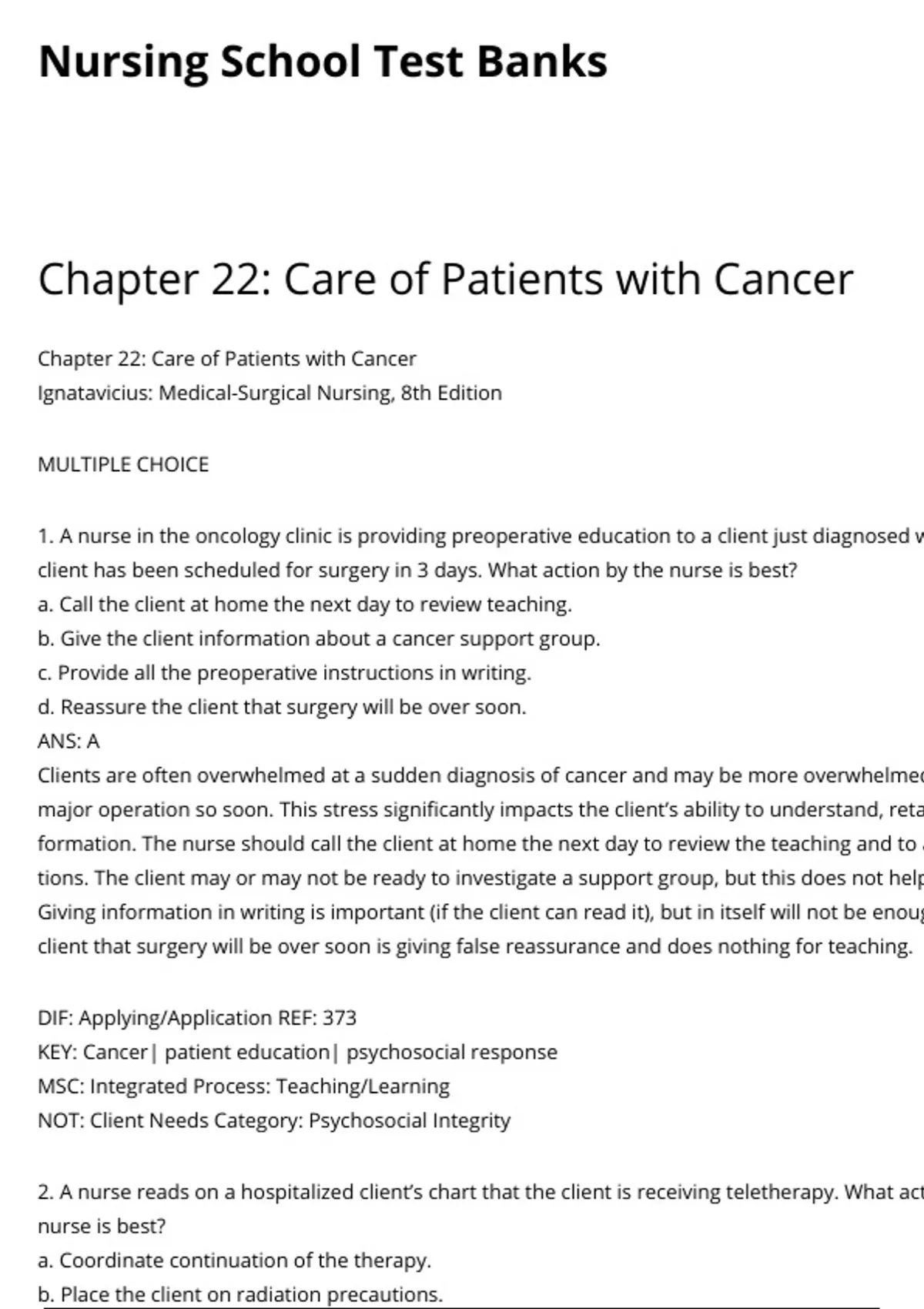 Chapter 22 Care of Patients with Cancer Nursing School Test Banks.