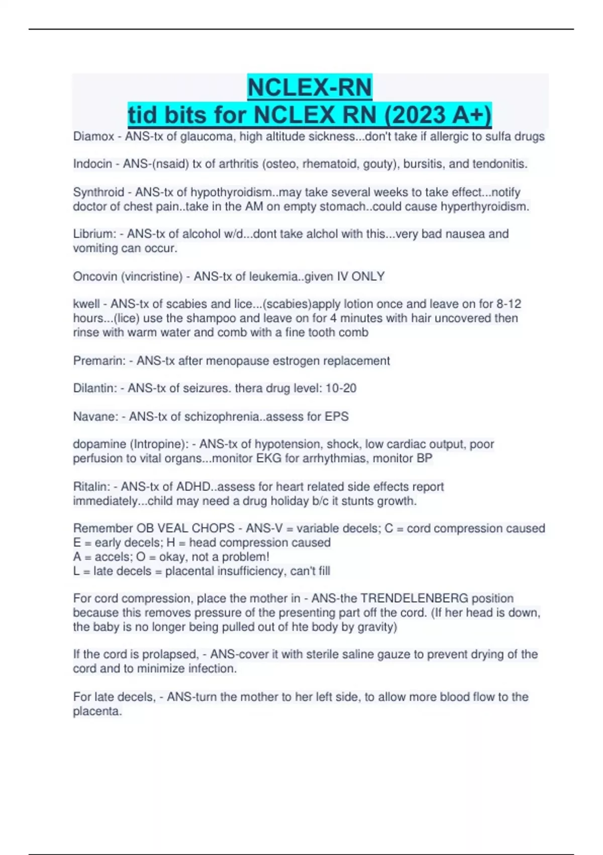 NCLEX-RN tid bits for NCLEX RN (2023 A+) Diamox - ANS-tx of glaucoma, high altitude sickness...don't take if allergic to sulfa drugs Indocin - ANS-(nsaid) tx of arthritis (osteo, rhematoid, gouty), bursitis, and tendonitis. Synthroid - ANS-tx of hypothyroidism..may take several weeks to take effect...notify doctor of chest pain..take in the AM on empty stomach..could cause hyperthyroidism. Librium: - ANS-tx of alcohol w/d...dont take alchol with this...very bad nausea and vomiting can occur. Oncovin (vincristine) - ANS-tx of leukemia..given IV ONLY kwell - ANS-tx of scabies and lice...(scabies)apply lotion once and leave on for 8-12 hours...(lice) use the shampoo and leave on for 4 minutes with hair uncovered then rinse with warm water and comb with a fine tooth comb Premarin: - ANS-tx after menopause estrogen replacement Dilantin: - ANS-tx of seizures. thera drug level: 10-20 Navane: - ANS-tx of schizophrenia..assess for EPS dopamine (Intropine): - ANS-tx of hypotension, shock, low cardiac output, poor perfusion to vital organs...monitor EKG for arrhythmias, monitor BP Ritalin: - ANS-tx of ADHD..assess for heart related side effects report immediately...child may need a drug holiday b/c it stunts growth. Remember OB VEAL CHOPS - ANS-V = variable decels; C = cord compression caused E = early decels; H = head compression caused A = accels; O = okay, not a problem! L = late decels = placental insufficiency, can't fill For cord compression, place the mother in - ANS-the TRENDELENBERG position because this removes pressure of the presenting part off the cord. (If her head is down, the baby is no longer being pulled out of hte body by gravity) If the cord is prolapsed, - ANS-cover it with sterile saline gauze to prevent drying of the cord and to minimize infection. For late decels, - ANS-turn the mother to her left side, to allow more blood flow to the placenta. For any kind of bad fetal heart rate pattern, - ANS-you give O2, often by mask... When doing an epidural anesthesia - ANS-hydration before hand is a priority. Major prego risks and Emergencies - ANS-Hypotension and bradypnea / bradycardia are major risks and emergencies NEVER check the monitor or a machine as a first action. Always assess the patient first; - ANS-for exmaple listen to the fetal heart tones with a stethoscope in NCLEX land. Sometimes it's hard to tell who to check on first, the mother or the baby; it's usually easy to tell the right answer if the mother or baby involves a machine. If you're not sure who to check first, and one of the choices involves the machine, that's the wrong answer. If the baby is a posterior presentation, - ANS-the heart sounds are heard at the sides. If the baby is anterior - ANS-, the sounds are heard closer to midline, between the umbilicus and where you would listen to a posterior presentation. If the baby is breech, - ANS-the sounds are high up in the fundus near the umbilicus. If the baby is vertex, they are a little bit above the symphysis pubis. ventilator alarms HOLD - ANS-High alarm- Obstruction due to incr. secretions, kink, pt. coughs, gag or bites Low press alarm- Disconnection or leak in ventilatior or in pt. airway cuff, pt. stops spontaneous breathing . to remember blood sugar: - ANS-hot and dry-sugar high (hyperglycemia) cold and clammy-need some candy (hypoglycemia) hyperglycemia - ANS-hot and dry-sugar high hypoglycemia - ANS-cold and clammy-need some candy ICP AND SHOCK HAVE OPPOSITE V/S - ANS-ICP-increased BP, decreased pulse, decreased resp. shock- decreased BP, increased pulse, increased resp. ICP - ANS--increased BP, decreased pulse, decreased resp. shock- - ANS-decreased BP, increased pulse, increased resp. cor pulmonae: - ANS-right sided heart failure caused by left ventricular failure (so pick edema, jvd, if it is a choice.) herion withdrawal neonate: - ANS-irratable poor sucking Jews: - ANS-no meat and milk together Brachial pulse: - ANS-pulse area cpr on an infant. Test child for lead poisioning around - ANS-12 months of age source of potassium - ANS-bananas, potatoes, citrus fruits, white beans, dark leafy greens, baked potato w/ skin, dried apricots, avocados, fish, mushrooms Cultures are obtained before - ANS-starting IV antibiotics sources of phosphorus - ANS-pumpkin seeds, organ meats, cheese, fish, shell fish,soy, beans, beef, pork, nuts a pt with leukemia may have - ANS-epitaxis b/c of low platelets best way to warm a newborn: - ANS-skin to skin contact covered with a blanket on mom. when a pt comes in and she is in active labor, nurses first action is to..... - ANS-is to listen to fetal heart tone/rate phobic disorders... - ANS-use systematic desensitiztion. When getting down to two answers, choose - ANS-the assessment answer (assess, collect, auscultate, monitor, palpate) over the intervention except in an emergency or distress situation. If one answer has an absolute, discard it. Give priority to answers that deal directly to the patient's body, not the machines/equipments. Key words are very important. Avoid answers with - ANS-absolutes for example: always, never, must, etc. with lower amputations patient is placed in - ANS-prone position. small frequent feedings are - ANS-better than larger ones. ____________ cannot be delegated to an Unlicensed Assistive Personnel - ANSAssessment, teaching, meds, evaluation, unstable patient . LVN/LPN cannot handle ________ - ANS-blood. Amynoglycosides (like vancomycin) cause - ANS-nephrotoxicity and ototoxicity. IV push should go over at least - ANS-2 minutes. If the patient is not a child an answer with family option - ANS-can be ruled out easily. In an emergency who do you treat 1st - ANS-, patients with greater chance to live are treated first ARDS is ________ DIC is __________ both are _____ - ANS-11. ARDS (fluids in alveoli), DIC (disseminated intravascular coagulaton) are always secondary to something else (another disease process). Cardinal sign of ARDS is - ANS-hypoxemia (low oxygen level in tissues). in pH regul