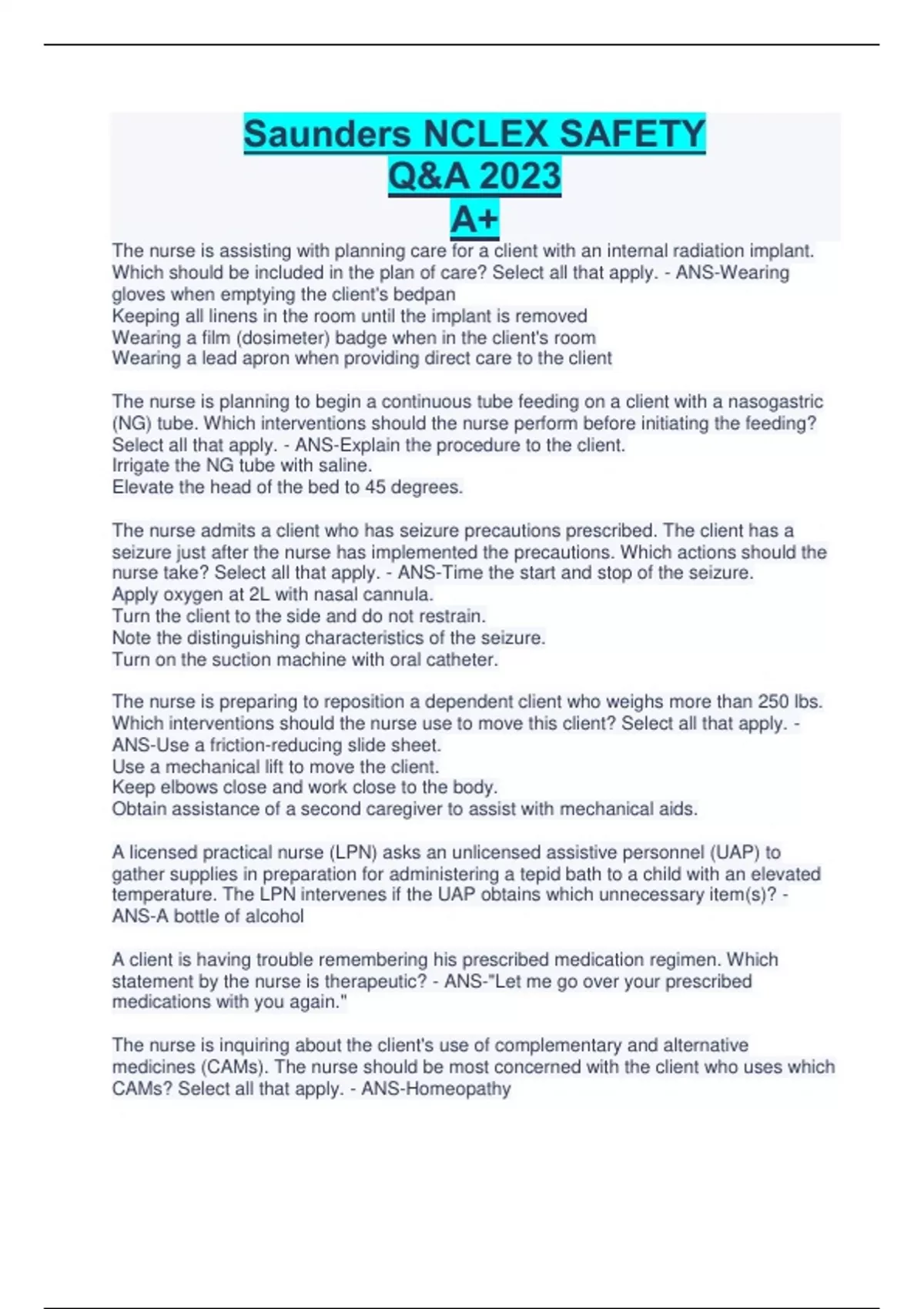 - Saunders NCLEX SAFETY Q&A 2023 A+