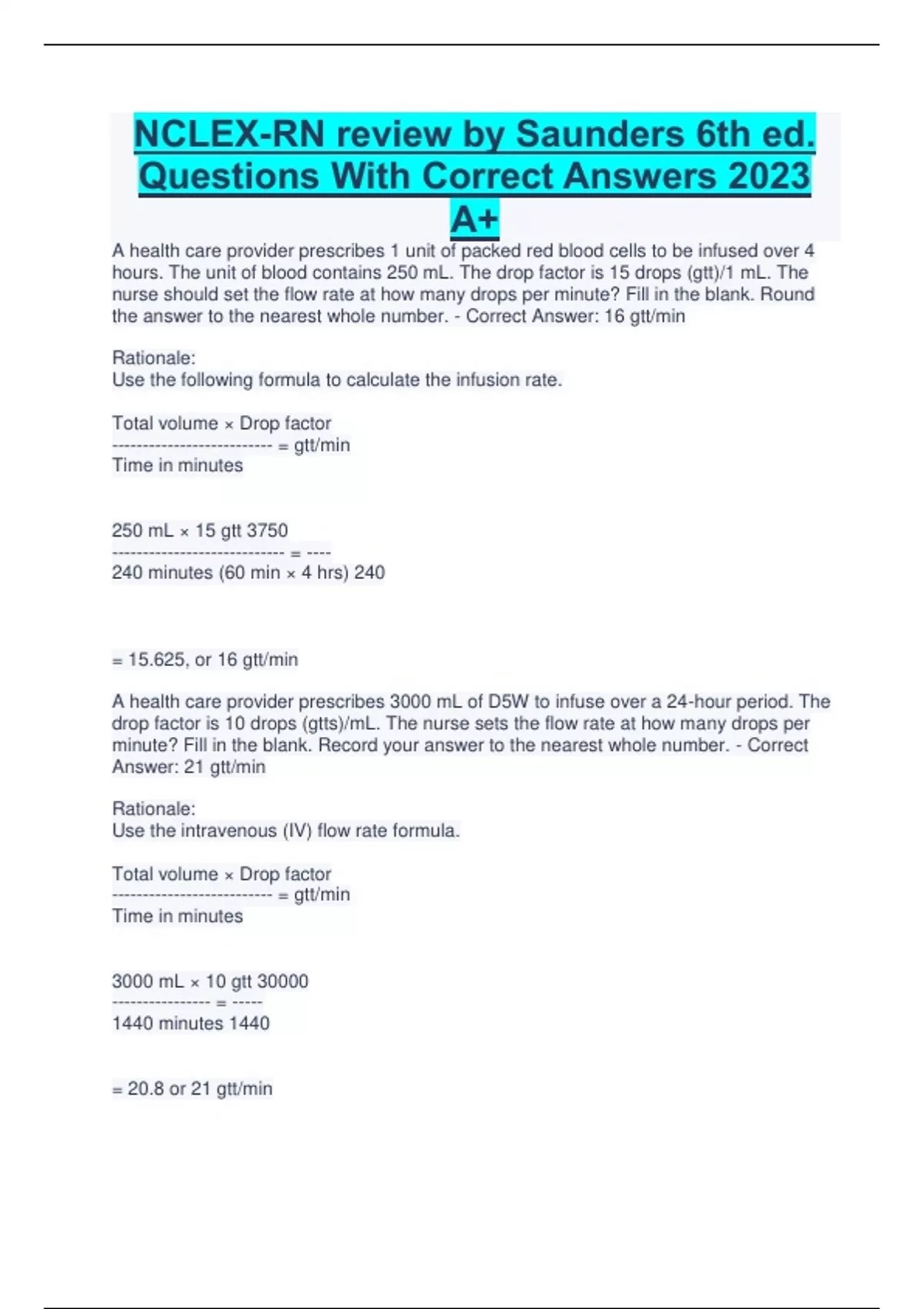 NCLEX-RN review by Saunders 6th ed. Questions With Correct Answers 2023 A+ A health care provider prescribes 1 unit of packed red blood cells to be infused over 4 hours. The unit of blood contains 250 mL. The drop factor is 15 drops (gtt)/1 mL. The nurse should set the flow rate at how many drops per minute? Fill in the blank. Round the answer to the nearest whole number. - Correct Answer: 16 gtt/min Rationale: Use the following formula to calculate the infusion rate. Total volume × Drop factor -------------------------- = gtt/min Time in minutes 250 mL × 15 gtt 3750 ---------------------------- = ---- 240 minutes (60 min × 4 hrs) 240 = 15.625, or 16 gtt/min A health care provider prescribes 3000 mL of D5W to infuse over a 24-hour period. The drop factor is 10 drops (gtts)/mL. The nurse sets the flow rate at how many drops per minute? Fill in the blank. Record your answer to the nearest whole number. - Correct Answer: 21 gtt/min Rationale: Use the intravenous (IV) flow rate formula. Total volume × Drop factor -------------------------- = gtt/min Time in minutes 3000 mL × 10 gtt 30000 ---------------- = ----- 1440 minutes 1440 = 20.8 or 21 gtt/min An adult client has had serum electrolyte levels drawn. The nurse receiving the results by telephone from the laboratory should be most concerned with which finding? - Potassium level, 5.4 mEq/L Rationale: The normal adult ranges of serum electrolyte levels are sodium, 135 to 145 mEq/L; chloride, 98 to 107 mEq/L; potassium, 3.5 to 5.0 mEq/L; and bicarbonate (venous), 22 to 29 mEq/L. The only abnormal value identified above is the serum potassium level, which would be the one of most concern to the nurse because of potential cardiac dysrhythmias. The nurse is assessing the intravenous (IV) dressing of a client with a peripheral IV infusion running. The date on the dressing is 7/25 (July 25). The nurse documents on the client's record that the dressing should be changed on which date? - 7/28 Rationale: IV site dressings should be changed every 48 to 72 hours, which is every 2 to 3 days. With an insertion date of 7/25, the due date for change, depending on agency policy, would be 7/27 or 7/28. It would be unnecessary, uncomfortable, and not cost effective to change the site dressing daily (option 1). Changing the site dressing every 5 or 7 days (options 3 and 4) would place the client at greater risk for infection or other catheter complications. Before enema administration, which position should the nurse assists the client to assume? - Left lateral position, with the right leg acutely flexed Rationale: The sigmoid and descending colons are located on the left side. Therefore the left lateral position uses gravity to facilitate the flow of solution into the sigmoid and descending colons. Acute flexion of the right leg allows for adequate exposure of the anus. The remaining options are incorrect positions. A hospitalized client who has been placed on contact precautions has been prescribed to have a chest radiograph in the radiology department. The nurse should plan to take which action on receipt of this prescription? - Question the health care provider about whether a portable chest radiograph may be obtained. The client who is placed on contact precautions has a high microorganism count in some type of body secretion (such as feces or wound drainage). This client is placed in a private room whenever possible and is removed from the room only when absolutely necessary. Client transport should be done only for essential purposes. Notification of departmental personnel and disinfection of any environmental surfaces with which the client has contact are imperative. The nurse is reviewing the laboratory test results for a client seen in the clinic. The nurse determines that the white blood cell (WBC) count is normal if which value is noted on the laboratory report? - 8600 cells/mm3 Rationale: The normal WBC count ranges from 4500 to 11,000 cells/mm3. Options 1 and 2 indicate low values. Option 4 indicates an elevated value. A client is at risk for pulmonary embolism and is on anticoagulant therapy with warfarin sodium (Coumadin). The client's prothrombin time is 20 seconds, with a control of 11 seconds. How should the nurse interpret these results? - Client results are within the therapeutic range. Rationale: The therapeutic range for prothrombin time is 1.5 to 2 times the control for clients at high risk for thrombus. Based on the client's control value, the therapeutic range for this individual would be 16.5 to 22 seconds; therefore the result is within the therapeutic range. The nurse is caring for a client with meningococcal pneumonia and implements which transmission-based precautions for this client? - Private room or cohort client Rationale: Meningococcal pneumonia is transmitted by droplet infection. Precautions for this disease include a private room or cohort client and use of a standard precaution mask. Private negative airflow pressure rooms and personal respiratory protection devices are required for clients with airborne disease such as tuberculosis. When appropriate, a mask must be worn by the client and not the staff when the client leaves the room. A client has been receiving a series of medications as part of intravenous antineoplastic therapy. The nurse should implement neutropenic precautions after noting which laboratory result for this client? - White blood cell (WBC) count of 2000 cells/mm3 Rationale: The normal WBC is 5000 to 10,000 cells/mm3. When the WBC count drops, neutropenic precautions should be implemented to protect the client from infection. Bleeding precautions should be initiated when the platelet count drops; bleeding precautions include avoiding trauma such as from rectal temperatures or injections. The normal platelet count is 150,000 to 450,000 cells/mm3. The normal clotting time is 8 to 15 minutes. The normal ammonia value is 10 to 80 mcg/dL. An adolescent is admitted to the hospital after an accidental g
