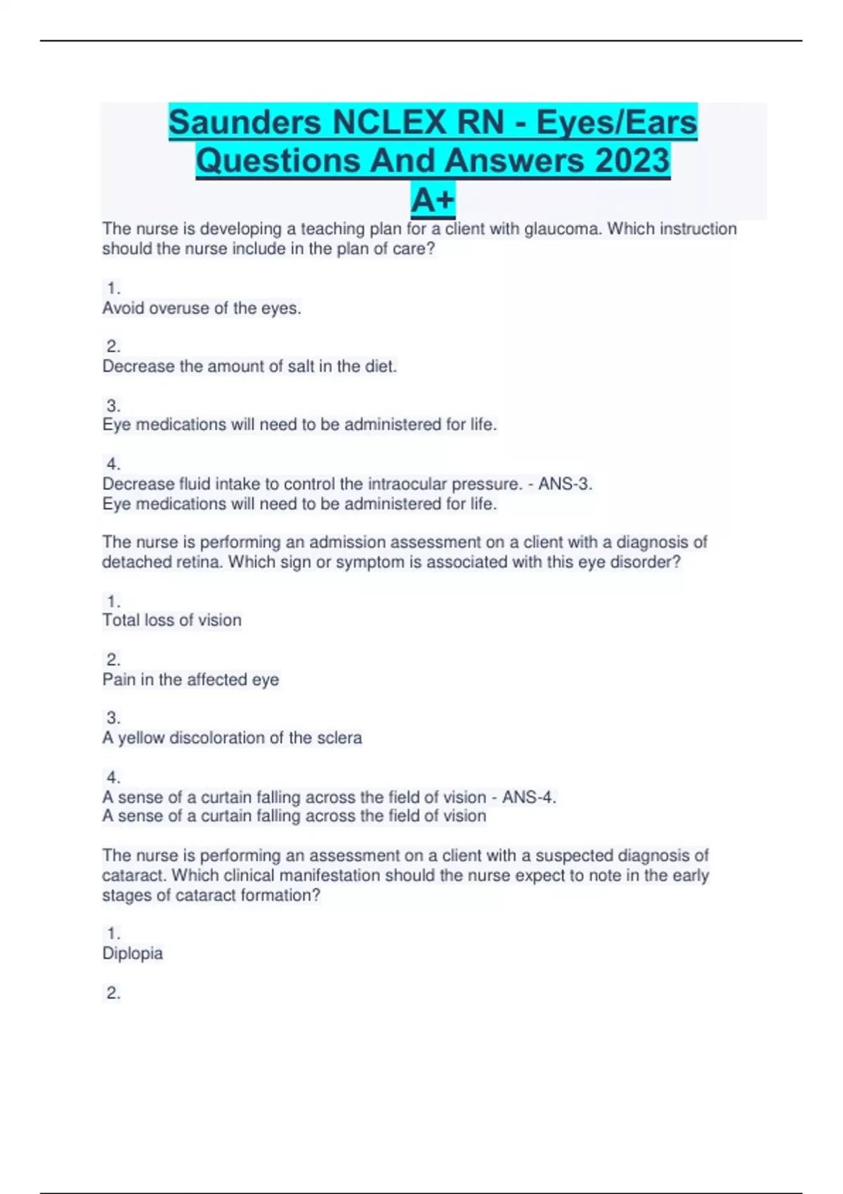 Saunders NCLEX RN - Eyes/Ears Questions And Answers 2023 A+ The nurse is developing a teaching plan for a client with glaucoma. Which instruction should the nurse include in the plan of care? 1. Avoid overuse of the eyes. 2. Decrease the amount of salt in the diet. 3. Eye medications will need to be administered for life. 4. Decrease fluid intake to control the intraocular pressure. - ANS-3. Eye medications will need to be administered for life. The nurse is performing an admission assessment on a client with a diagnosis of detached retina. Which sign or symptom is associated with this eye disorder? 1. Total loss of vision 2. Pain in the affected eye 3. A yellow discoloration of the sclera 4. A sense of a curtain falling across the field of vision - ANS-4. A sense of a curtain falling across the field of vision The nurse is performing an assessment on a client with a suspected diagnosis of cataract. Which clinical manifestation should the nurse expect to note in the early stages of cataract formation? 1. Diplopia 2. Eye pain 3. Floating spots 4. Blurred vision - ANS-4. Blurred vision The nurse is preparing a teaching plan for a client who had a cataract extraction with intraocular implantation. Which home care measures should the nurse include in the plan? Select all that apply. 1. Avoid activities that require bending over. 2. Contact the surgeon if eye scratchiness occurs. 3. Take acetaminophen for minor eye discomfort. 4. Expect episodes of sudden severe pain in the eye. 5. Place an eye shield on the surgical eye at bedtime. 6. Contact the surgeon if a decrease in visual acuity occurs. - ANS-1. Avoid activities that require bending over. 3. Take acetaminophen for minor eye discomfort. 5. Place an eye shield on the surgical eye at bedtime. 6. Contact the surgeon if a decrease in visual acuity occurs. Tonometry is performed on a client with a suspected diagnosis of glaucoma. The nurse looks at the documented test results and notes an intraocular pressure (IOP) value of 23. What should be the nurse's initial action? 1. Apply normal saline drops. 2. Note the time of day the test was done. 3. Contact the health care provider (HCP). 4. Instruct the client to sleep with the head of the bed flat. - ANS-2. Note the time of day the test was done. A client's vision is tested with a Snellen chart. The results of the tests are documented as 20/60. What action should the nurse implement based on this finding? 1. Provide the client with materials on legal blindness. 2. Instruct the client that he or she may need glasses when driving. 3. Inform the client of where he or she can purchase a white cane with a red tip. 4. Inform the client that it is best to sit near the back of the room when attending lectures. - ANS-2. Instruct the client that he or she may need glasses when driving. A client is diagnosed with glaucoma. Which piece of nursing assessment data identifies a risk factor associated with this eye disorder? 1. Cardiovascular disease 2. Frequent urinary tract infections 3. A history of migraine headaches 4. Frequent upper respiratory infections - ANS-1. Cardiovascular disease A client with retinal detachment is admitted to the nursing unit in preparation for a repair procedure. Which prescription should the nurse anticipate? 1. Allowing bathroom privileges only 2. Elevating the head of the bed to 45 degrees 3. Wearing dark glasses to read or watch television 4. Placing an eye patch over the client's affected eye - ANS-4. Placing an eye patch over the client's affected eye The nurse is caring for a client who was recently diagnosed with primary open-angle glaucoma (POAG). Which assessment finding is specific to this type of glaucoma? 1. Client report of blurred vision 2. Client report of "tunnel vision" 3. Client report of ocular erythema 4. Client report of halos around lights - ANS-2. Client report of "tunnel vision" The nurse in the health care clinic is providing instructions to a client regarding the use of a hearing aid. Which statement is most appropriate for the nurse to include? 1. "The hearing aid should not be worn if an ear infection is present." 2. "The ear mold for the hearing aid should be washed with mild soap and water once a month." 3. "The hearing aid should be removed from the ear at the end of the day and then turned off after removal." 4. "The hearing aid contains a lifelong battery, so you will not need to be concerned about changing batteries." - ANS-1. "The hearing aid should not be worn if an ear infection is present." The nurse is preparing to provide care for a client who will need an ear irrigation to remove impacted cerumen. Which interventions should the nurse take when performing the irrigation? Select all that apply. Continues...