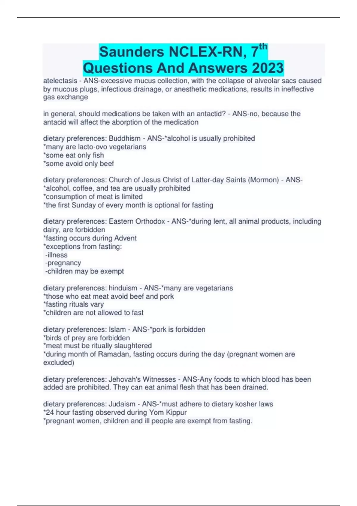 Saunders NCLEX-RN, 7th Questions And Answers 2023 atelectasis - ANS-excessive mucus collection, with the collapse of alveolar sacs caused by mucous plugs, infectious drainage, or anesthetic medications, results in ineffective gas exchange in general, should medications be taken with an antactid? - ANS-no, because the antacid will affect the aborption of the medication dietary preferences: Buddhism - ANS-*alcohol is usually prohibited *many are lacto-ovo vegetarians *some eat only fish *some avoid only beef dietary preferences: Church of Jesus Christ of Latter-day Saints (Mormon) - ANS- *alcohol, coffee, and tea are usually prohibited *consumption of meat is limited *the first Sunday of every month is optional for fasting dietary preferences: Eastern Orthodox - ANS-*during lent, all animal products, including dairy, are forbidden *fasting occurs during Advent *exceptions from fasting: -illness -pregnancy -children may be exempt dietary preferences: hinduism - ANS-*many are vegetarians *those who eat meat avoid beef and pork *fasting rituals vary *children are not allowed to fast dietary preferences: Islam - ANS-*pork is forbidden *birds of prey are forbidden *meat must be ritually slaughtered *during month of Ramadan, fasting occurs during the day (pregnant women are excluded) dietary preferences: Jehovah's Witnesses - ANS-Any foods to which blood has been added are prohibited. They can eat animal flesh that has been drained. dietary preferences: Judaism - ANS-*must adhere to dietary kosher laws *24 hour fasting observed during Yom Kippur *pregnant women, children and ill people are exempt from fasting. *during passover, only unleavened bread is eaten Dietary Kosher laws - ANS-*meats allowed include animals that vegetable eaters, cloven-hoofed animals (deer, cattle, goats, sheep), and animals that are ritually slaughtered. *fish that have scales and fins are allowed *meat (including fish) cannot be eaten with dairy Pentecostal (Assembly of God) dietary preferences - ANS-*alcohol is usually prohibited *no food to which blood has been added *some avoid pork Roman Catholic dietary preferences - ANS-*avoid meat on ash Wednesday and Fridays on lent *optional fasting during lent season *children, pregnant women, and ill individuals are exempt from fasting Seventh-Day Adventist (Church of God) - ANS-*alcohol and caffeinated beverages are usually prohibited *many are lacto-ovo vegetarians *those who eat meat avoid pork *overeating is prohibited; 5 to 6 hours between meal without snacking is practiced African Americans: description - ANS-citizens or residents of the united states who may have origins in any of the black populations in Africa. African Americans: communication - ANS-*standard english *head nodding doesn't always mean agreement *prolonged eye contact may be viewed negatively *non-verbal communication may be important *personal questions on initial contact viewed as intrusive African Americans: time orientation and personal space preferences - ANS-*time orientation varies and may include past, present, or future orientation *relationships and events may be considered more important than timeliness *comfortable with close personal space when interacting with family and friends African Americans: social roles - ANS-*large extended family networks are important; older adults are respected *many households are headed by a single female parent *religion and church are sources of strength African Americans: food preferences - ANS-*fried foods *chicken *pork *greens such as collard greens *rice *some pregnant women suffer from pica African Americans: health risks - ANS-*sickle cell anemia *hypertension *heart disease *cancer *lactose intolerance *diabetes mellitus *obesity African Americans: cultural interventions - ANS-*assess the meaning of verbal and nonverbal behavior *be flexible and avoid rigidity in scheduling care *encourage family involvement *alternative modes of healing include herbs, prayer, and laying on of hands practices Amish: Description - ANS-*known for simple living, plain dress, and reluctance to adopt modern convenience *Christian religious denominations (Mennonite churches) *cultural beliefs and preferences vary depending on specific amish community Amish: Communication - ANS-*usually speak a German dialect (Pennsylvania Dutch) *German used during worship *English learned in school Amish: social roles - ANS-*women are not allowed to hold positions of power in the congregation *roles for women are considered equally important to those of men, but are very unequal in terms of authority *family life has a patriarchal structure *marriage outside of the faith is not usually allowed; unmarried women remain under the authority of their fathers Amish: health and illness - ANS-*most will need church (bishop and community) permission to be hospitalized as the community will come together to pay the costs *most likely will not have health insurance *barriers to modern health care include distance, lack of transportation, cost, and language (scientific jargon is not often understood) Amish: health risks - ANS-*in general, they have fewer risks for disease because of their lifestyle (manual labor, diet, rare use of tobacco/alcohol) *genetic disorders are a risk because of intermarriage *nonimmunization *sexual abuse of women Amish: cultural interventions - ANS-*include husband or father in health care decisions for female members *health care instructions must be given in simple, clear language *teaching should be focused on health implications associated with nonimmunization, intermarriage, and sexual abuse issues Asian Americans: communication - ANS-*languages include Chinese, Japanese, Korean, Filipino, Vietnamese, and English *silence is valued *eye contact may be considered inappropriate or disrespectful (some cultures see it as a sexual invite) *criticism or disagreement is not expressed verbally *head nodding doesn't always mean agreement *the word "no" may be interpreted as 