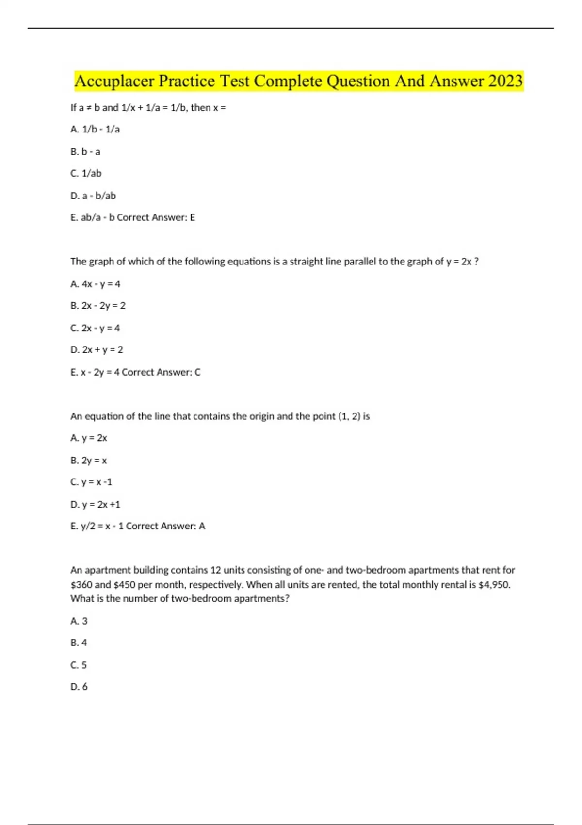 Accuplacer Practice Test Complete Question And Answer 2023 If a ≠ b and 1/x + 1/a = 1/b, then x = A. 1/b - 1/a B. b - a C. 1/ab D. a - b/ab E. ab/a - b Correct Answer: E The graph of which of the following equations is a straight line parallel to the graph of y = 2x ? A. 4x - y = 4 B. 2x - 2y = 2 C. 2x - y = 4 D. 2x + y = 2 E. x - 2y = 4 Correct Answer: C An equation of the line that contains the origin and the point (1, 2) is A. y = 2x B. 2y = x C. y = x -1 D. y = 2x +1 E. y/2 = x - 1 Correct Answer: A