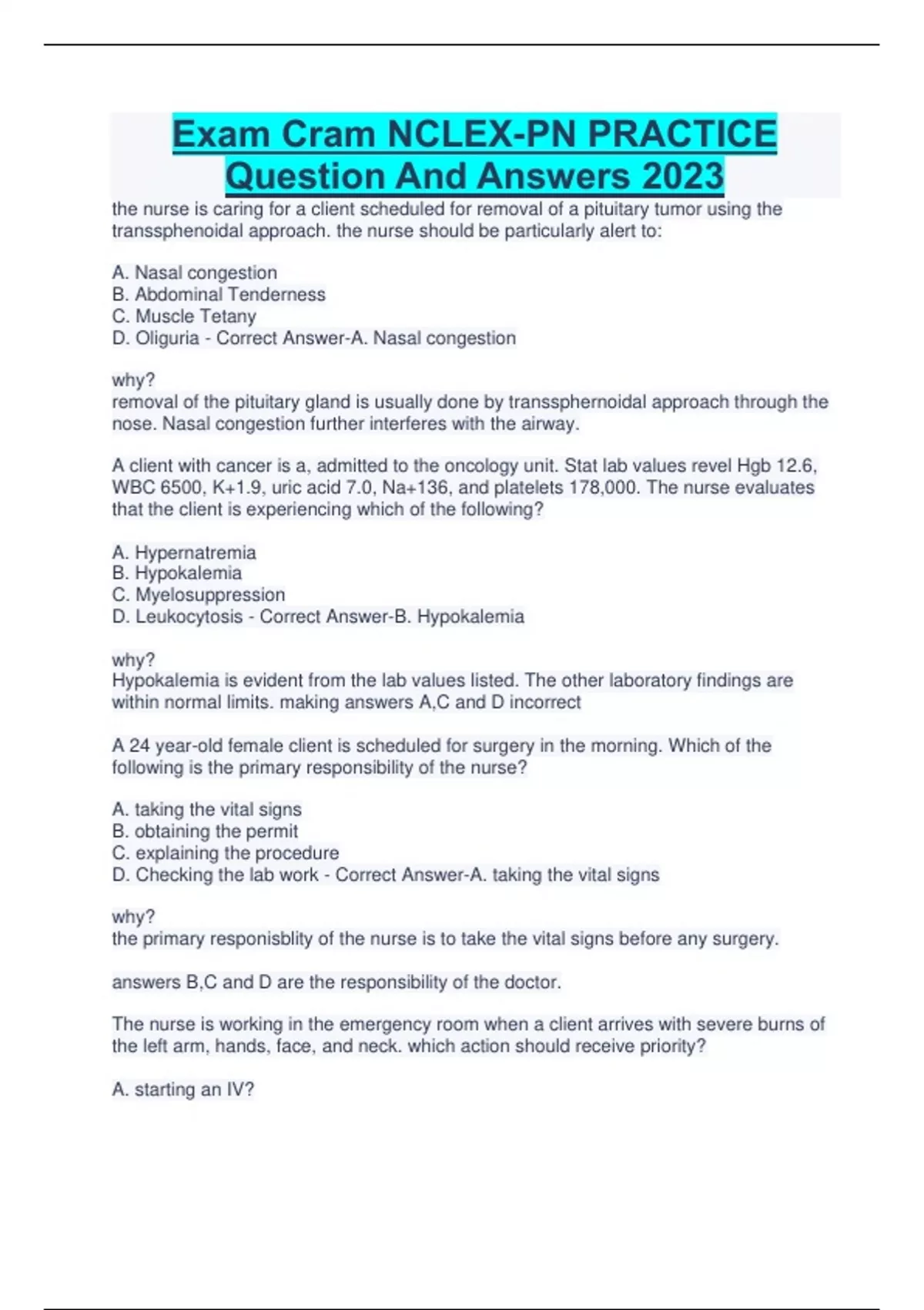 Exam Cram NCLEX-PN PRACTICE Question And Answers 2023 the nurse is caring for a client scheduled for removal of a pituitary tumor using the transsphenoidal approach. the nurse should be particularly alert to: A. Nasal congestion B. Abdominal Tenderness C. Muscle Tetany D. Oliguria - Correct Answer-A. Nasal congestion why? removal of the pituitary gland is usually done by transsphernoidal approach through the nose. Nasal congestion further interferes with the airway. A client with cancer is a, admitted to the oncology unit. Stat lab values revel Hgb 12.6, WBC 6500, K+1.9, uric acid 7.0, Na+136, and platelets 178,000. The nurse evaluates that the client is experiencing which of the following? A. Hypernatremia B. Hypokalemia C. Myelosuppression D. Leukocytosis - Correct Answer-B. Hypokalemia why? Hypokalemia is evident from the lab values listed. The other laboratory findings are within normal limits. making answers A,C and D incorrect A 24 year-old female client is scheduled for surgery in the morning. Which of the following is the primary responsibility of the nurse? A. taking the vital signs B. obtaining the permit C. explaining the procedure D. Checking the lab work - Correct Answer-A. taking the vital signs why? the primary responisblity of the nurse is to take the vital signs before any surgery. answers B,C and D are the responsibility of the doctor. The nurse is working in the emergency room when a client arrives with severe burns of the left arm, hands, face, and neck. which action should receive priority? A. starting an IV? B. Applying oxygen C.Obtaining blood gas D. Medicating the client foe pain - Correct Answer-B. Applying oxygen why? the client with burns to the neck needs airway assessments and supplemental oxygen, so applying oxygen is priority. the next action should be to start an IV and medicate for pain. The nurse is visiting a home health client with osteoporosis. The client has a new prescription for alendronate (Fosamax). Which instructions should be given to the client A. rest in bed after taking the medication for at least 30 mins B. Avoid rapid movements after taking the medication C. Take medication with water only D. Allow at least 1 hour between taking the medicine and taking other medications - Correct Answer-C. Take medication with water only why? Fosmax should be taken with water only. The client should also remain upright for at least 30 mins after taking the medication. The nurse is making initial rounds on a client with a C5 fracture and crutchfield thongs. Which equipment should be kept at the bedside? A. A pair of forceps B. A torque wrench C. A pair or wire cutters D. A screwdriver - Correct Answer-B. A torque wrench why? A tourque wrench is kept at the bedside to tighten and loosen the screws of crutchfield tongs. This wrench controls the amount of pressure that is placed on the screws. An infant weighs 7 pounds at birth. The excpectd weight by 1 year should be: A. 10 pounds B.12 pounds C. 18 pounds D. 21 pounds - Correct Answer-D. 21 pounds why? A birth weight of 7 pounds would indicate 21 pounds in 1 year or triple the his birth weight. A client is admitted with a Ewing's sacroma. which symptoms would be expected due to this tumor's location? A. Hemiplegia B. Aphasia C. Nausea D. Bone Pain - Correct Answer-D. Bone Pain why? Sacroma is a type of bone cancer, therefor, bone pain would be expected The nurse is caring for a client with epilepsy who is being treated with carbamazepine (Tegretol). Which labatory value might be a indicate a serious side effect of this drug? A. Uric acid of 5mg/dL B. Hematoccrit of 33% C. WBC 2,000 per cubic millimeter D. Platelets 150,000 per cubic millimeter - Correct Answer-C. WBC 2,000 per cubic millimeter why? Tegratol can suppress the bone marrow and decrease the white blood cells count; thus, a lab value of WBC 2,000 per cubic millimeter indicates side effects of the drug. A 6-month-old client is admitted with possible intussuception. Which question during the nursing history is least helpful in obtaining information regarding this diagnosis? A. "tell me about the pain" B."what does his vomit look like?" C." Describe his usual diet." D. " have you noticed changes in his adominal size?" - Correct Answer-C." Describe his usual diet." why? The least-helpful questions are those describing his usual diet. A, B, and D are useful in determining the extent of disease process and thus, are incorrect The nurse is assisting a client with diverticulosis to select appropiate foods. Which food should be avoided? A. Bran B. Fresh Peaches C. Cucumber salad D. Yeast Rolls - Correct Answer-C. Cucumber salad why? the client with diverticulitis should avoid foods with seeds. A client has rectal cancer and is scheduled for an abdominal perineal resection. What should be the priority nursing care during the post-op period? A. Teaching how to irrigate the illeostomy B. Stopping electrolytes loss in the incisional area C. Encouraging a high fiber diet D. Facilitating perineal wound drainage - Correct Answer-D. Facilitating perineal wound drainage why? the client with a perineal resection will have a perineal incision. Drains will be used to facilitate wound drainage. This will help prevent infection of the surgical site. The client will not have an illestomy. as in answer A he will have some electrolyte loss, but treatment is not focused on preventing the loss, so answer B is incorrect A high fiber diet in answer C is not ordered at this time. The nurse is performing discharge teaching on a client with diverticulitis who has been placed on low-roughage diet. Which food would have to be eliminated from this client's diet? A. Roasted Chicken B. Noodles C. Cooked Broccoli D. Custard - Correct Answer-C. Cooked Broccoli why? the client with diverticulitis should avoid eating foods that are gas forming and that increase abdominal discomfort, such as cooked broccoli. The nurse is caring for a new mother. The mother asks why her baby has lost weight 