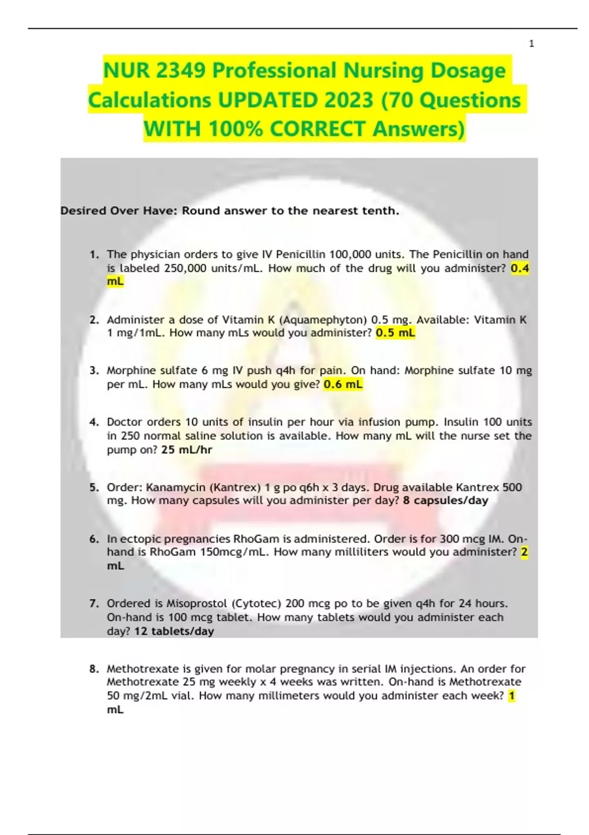 NUR 2349 Professional Nursing Dosage Calculations UPDATED 2023 (70 Questions WITH 100% CORRECT Answers) Desired Over Have: Round answer to the nearest tenth. 1. The physician orders to give IV Penicillin 100,000 units. The Penicillin on hand is labeled 250,000 units/mL. How much of the drug will you administer? 0.4 mL 2. Administer a dose of Vitamin K (Aquamephyton) 0.5 mg. Available: Vitamin K 1 mg/1mL. How many mLs would you administer? 0.5 mL 3. Morphine sulfate 6 mg IV push q4h for pain. On hand: Morphine sulfate 10 mg per mL. How many mLs would you give? 0.6 mL 4. Doctor orders 10 units of insulin per hour via infusion pump. Insulin 100 units in 250 normal saline solution is available. How many mL will the nurse set the pump on? 25 mL/hr 5. Order: Kanamycin (Kantrex) 1 g po q6h x 3 days. Drug available Kantrex 500 mg. How many capsules will you administer per day? 8 capsules/day 6. In ectopic pregnancies RhoGam is administered. Order is for 300 mcg IM. On- hand is RhoGam 150mcg/mL. How many milliliters would you administer? 2 mL 7. Ordered is Misoprostol (Cytotec) 200 mcg po to be given q4h for 24 hours. On-hand is 100 mcg tablet. How many tablets would you administer each day? 12 tablets/day 8. Methotrexate is given for molar pregnancy in serial IM injections. An order for Methotrexate 25 mg weekly x 4 weeks was written. On-hand is Methotrexate 50 mg/2mL vial. How many millimeters would you administer each week? 1 mL 9. Dexamethasone is used in preterm labor patients. Order is for 6 mg every 12 hrs for 2 doses. On-hand is Dexamethasone 12 mg/2mL vial. How many millimeters would you administer per dose? 1 mL 10. Zofran (Ordansetron) 8 mg tablets po q4-6 hrs PRN. On-hand is Zofran 4 mg. How many tablets would you administer? 2 tablets 11. The physician ordered Digoxin 250 mcg po qid. The label reads 1 tablet equals 0.25 mg. How many tablets will you administer? 1 tablet 12. The nonsteroidal medication naproxen (Naprosyn) has been prescribed for a patient, 1375 mg/day in divided doses. Each tablet contains 0.275 g. How many tablets equal this daily dose? 5 tablets 13. The order is to give 600 mg of Ampicillin IM qhr. The directions for dilution on the 2gm vial reads: Reconstitution with 4.8 mL of sterile water to obtain a concentration of 400 mg per mL. How many mL will you administer per dose? 1.5 mL 14. The physician ordered 180 mg of Dilantin po q8h. The patient weighs 98 lbs. The label of the drug reads 250 mg per 5 mL. How many milliliters will you administer to the patient per dose? 3.6 mL 15. The physician ordered Amoxicillin 10 mg IM q6h. Amoxicillin is supplied in 125 mg per 5 mL. How many milliliters will you administer per dose? 0.4 mL 16. Ordered: Atropine 0.6 mg IM. Label reads 0.3mg per 0.6 mL. How many milliliters will you give per dose? 1.2 mL Fluid Maintenance: Round to the nearest whole number. 17. An infant weighs 40 lbs. What is the required of fluid per day in mL? 1,409 mL/day 18. Infuse 695 mL over the next 900 min by infusion pump. What is the IV flow rate in mL/hr? 46 mL/hr