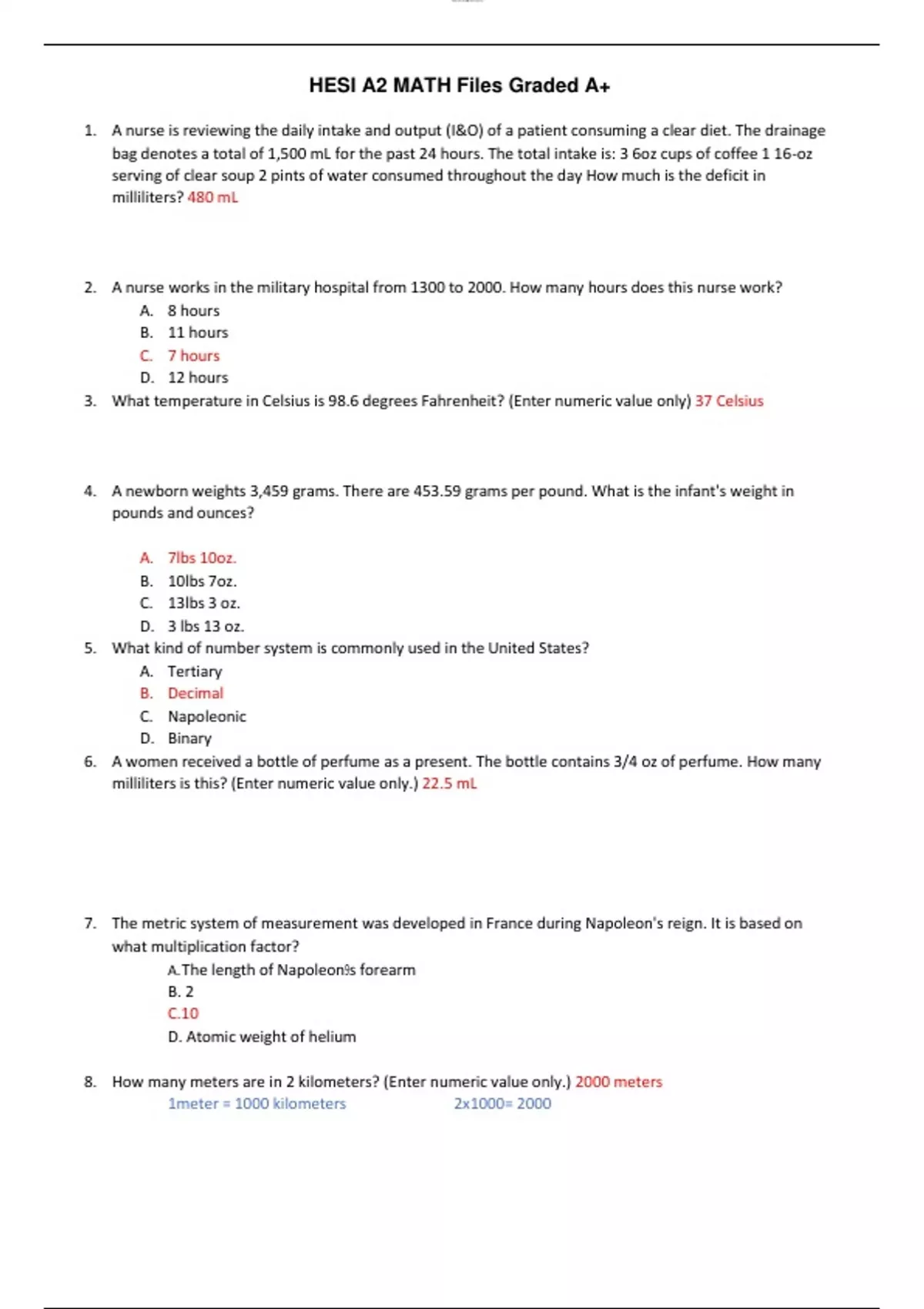 1. A nurse is reviewing the daily intake and output (I&O) of a patient consuming a clear diet. The drainage bag denotes a total of 1,500 mL for the past 24 hours. The total intake is: 3 6oz cups of coffee 1 16-oz serving of clear soup 2 pints of water consumed throughout the day How much is the deficit in milliliters? 480 mL 2. A nurse works in the military hospital from 1300 to 2000. How many hours does this nurse work? A. 8 hours B. 11 hours C. 7 hours D. 12 hours 3. What temperature in Celsius is 98.6 degrees Fahrenheit? (Enter numeric value only) 37 Celsius 4. A newborn weights 3,459 grams. There are 453.59 grams per pound. What is the infant's weight in pounds and ounces? A. 7lbs 10oz. B. 10lbs 7oz. C. 13lbs 3 oz. D. 3 lbs 13 oz. 5. What kind of number system is commonly used in the United States? A. Tertiary B. Decimal C. Napoleonic D. Binary 6. A women received a bottle of perfume as a present. The bottle contains 3/4 oz of perfume. How many milliliters is this? (Enter numeric value only.) 22.5 mL 7. The metric system of measurement was developed in France during Napoleon's reign. It is based on what multiplication factor? A. The length of Napoleon9s forearm B. 2 C.10 D. Atomic weight of helium 8. How many meters are in 2 kilometers? (Enter numeric value only.) 2000 meters 1meter = 1000 kilometers 2x1000= 2000 9. How many kilograms are in 2000 grams? (Enter numeric value only.) 2 kilograms Kg g mg (move 3 times to the right or left) (L) to (s) ex: 2000=2 or 2=2000 10. To convert pounds to kilograms, what factor is used? 2.2 1 pound = 2.2 kilogram 10. A teacher's aide is preparing a snack for the class. In order to prepare the powdered drink, the aide must convert the directions to metric. The directions say, "Dilute contents of package in 3 quarts of water." The aide has a measuring device marked in liters. How many liters of water should be used? (Enter numeric value only. If rounding is required, round to the nearest tenth.)