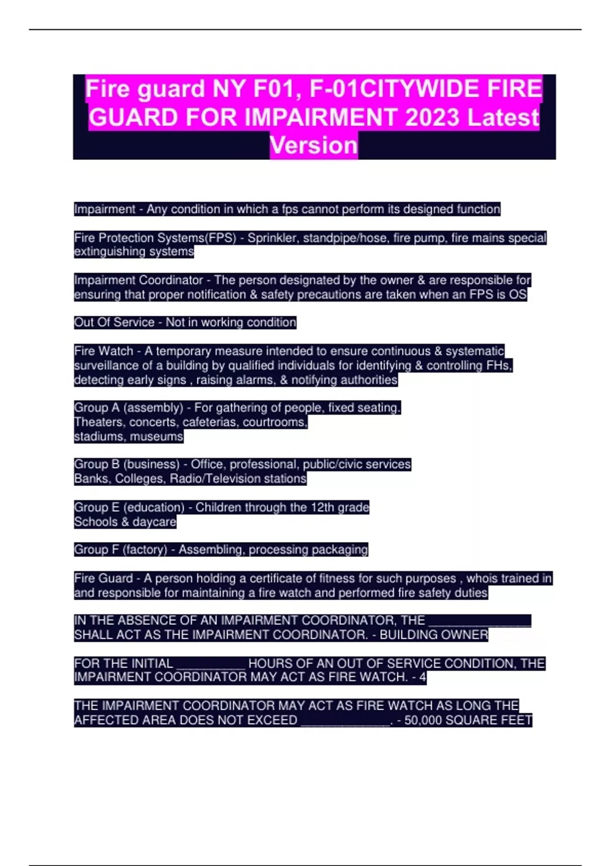 Impairment - Any condition in which a fps cannot perform its designed function Fire Protection Systems(FPS) - Sprinkler, standpipe/hose, fire pump, fire mains special extinguishing systems Impairment Coordinator - The person designated by the owner & are responsible for ensuring that proper notification & safety precautions are taken when an FPS is OS Out Of Service - Not in working condition Fire Watch - A temporary measure intended to ensure continuous & systematic surveillance of a building by qualified individuals for identifying & controlling FHs, detecting early signs , raising alarms, & notifying authorities Group A (assembly) - For gathering of people, fixed seating. Theaters, concerts, cafeterias, courtrooms, stadiums, museums Group B (business) - Office, professional, public/civic services Banks, Colleges, Radio/Television stations Group E (education) - Children through the 12th grade Schools & daycare Group F (factory) - Assembling, processing packaging Fire Guard - A person holding a certificate of fitness for such purposes , whois trained in and responsible for maintaining a fire watch and performed fire safety duties IN THE ABSENCE OF AN IMPAIRMENT COORDINATOR, THE _______________ SHALL ACT AS THE IMPAIRMENT COORDINATOR. - BUILDING OWNER FOR THE INITIAL __________ HOURS OF AN OUT OF SERVICE CONDITION, THE IMPAIRMENT COORDINATOR MAY ACT AS FIRE WATCH. - 4 THE IMPAIRMENT COORDINATOR MAY ACT AS FIRE WATCH AS LONG THE AFFECTED AREA DOES NOT EXCEED _____________. - 50,000 SQUARE FEET VALID FIRE GUARD COF'S ARE AS FOLLOWS: - F-01, F-32, F-36, AND F-91 THE COF HOLDER MUST KEEP HIS CERTIFICATE ______________ FOR INSPECTION BY A REPRESENTATIVE OF THE FDNY. - READILY AVAILABLE THE FIRE GUARD FOR IMPAIRMENT MUST BE FAMILIAR WITH THE TYPES OF ___________ PLANS FOR THE BUILDINGS WHERE THEY PROVIDE FIRE WATCH. - FIRE SAFETY EVACUATION FIRE GUARDS MUST HAVE A GENERAL KNOWLEDGE OF ________________ AND _____________. - PORTABLE FIRE EXTINGUISHERS, ALARM PULL STATIONS. INDIVIDUALS AND PREMISES CANNOT DEPEND ON ___________ FIRE PROTECTION SYSTEMS TO PROTECT THEM. - IMPAIRED F-01 IS VALID AT ANY LOCATION ON A __________ BASIS. - CITYWIDE WHEN FIRE GUARDS ARRIVE FOR DUTY, THEY SHOULD BE PROVIDED WITH AN ORIENTATION FROM THE ______________, BUILDING OWNER, OR IMPAIRMENT COORDINATOR. - FIRE SAFETY DIRECTOR NORMALLY, THERE IS AT LEAST ONE FSD IN A GROUP _______ OR GROUP _________ BUILDING. - B, R-1 THE FIRE GUARD MUST WORK CLOSELY WITH THE __________. - FSD HAZARDOUS MATERIALS SHALL BE STORED, HANDLED, OR USED AWAY FROM ANY ___________. - IGNITION SOURCES MAXIMUM QUANTITY OF AEROSOL PRODUCTS IN A DISPLAY MAY BE ___________. - 10,000 POUNDS MAXIMUM QUANTITY OF AEROSOL PRODUCTS PER FLOOR IN A WAREHOUSE IS ___________. - 24,000 POUNDS THE HIGHER THE RISK OF __________, THE MORE ATTENTION TO BUILDING FAMILIARITY THE FIRE GUARD MUST HAVE. - IMPAIRMENT FIRE GUARDS SHOULD MAKE INSPECTIONS AT LEAST ONCE EVERY ____________. - HOUR FIRE GUARDS SHALL INSPECT FOR ______________. - SMOKE AND FIRE THE GUARD SHALL ENSURE THAT __________ STATIONS ARE AVAILABLE. - FIRE ALARM PULL