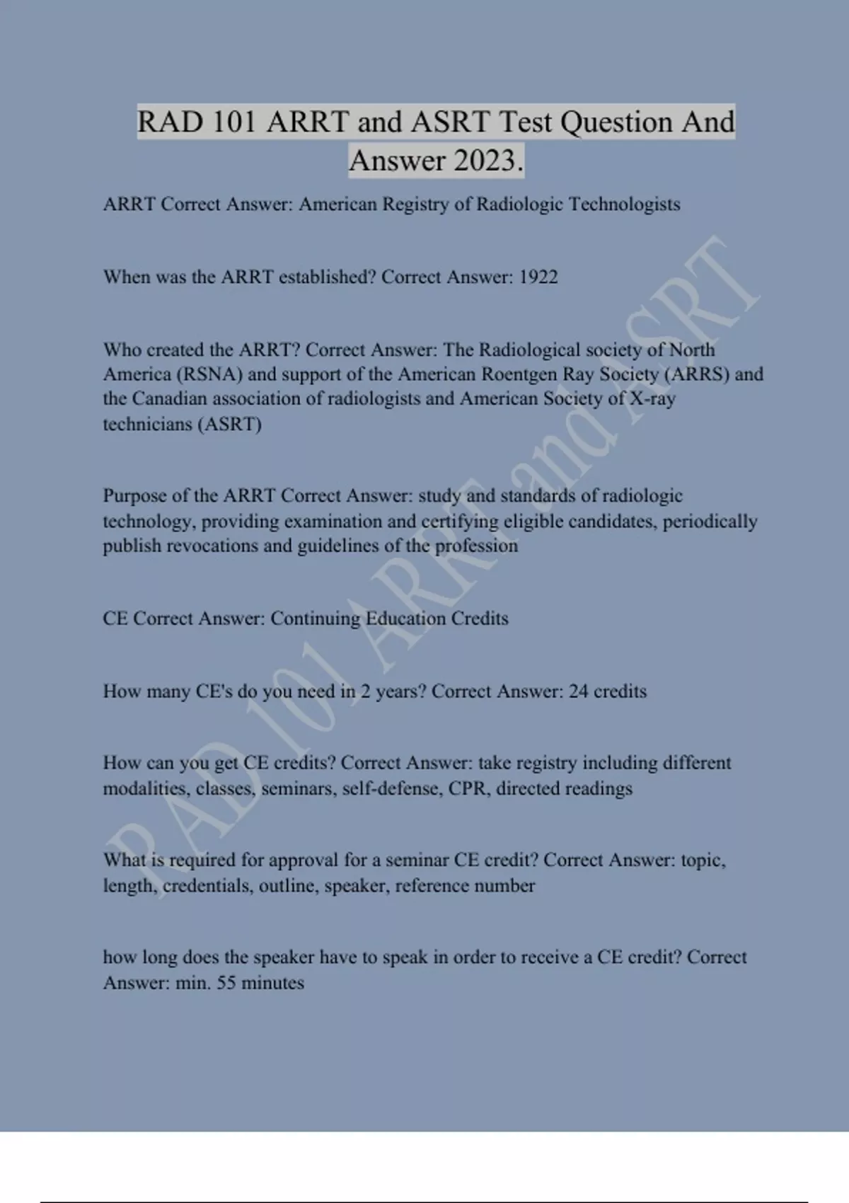 RAD 101 ARRT and ASRT Test Question And Answer 2023. ARRT Correct Answer: American Registry of Radiologic Technologists When was the ARRT established? Correct Answer: 1922 Who created the ARRT? Correct Answer: The Radiological society of North America (RSNA) and support of the American Roentgen Ray Society (ARRS) and the Canadian association of radiologists and American Society of X-ray technicians (ASRT) Purpose of the ARRT Correct Answer: study and standards of radiologic technology, providing examination and certifying eligible candidates, periodically publish revocations and guidelines of the profession CE Correct Answer: Continuing Education Credits How many CE's do you need in 2 years? Correct Answer: 24 credits How can you get CE credits? Correct Answer: take registry including different modalities, classes, seminars, self-defense, CPR, directed readings What is required for approval for a seminar CE credit? Correct Answer: topic, length, credentials, outline, speaker, reference number how long does the speaker have to speak in order to receive a CE credit? Correct Answer: min. 55 minutes When does your biennium start? Correct Answer: in your birth month How many credits will you earn if you pass a registry? Correct Answer: 24 credits When is the annual report sent out? Correct Answer: each year in a magazine that includes the sanctions and new rules What can happen if you do not complete all CE's? Correct Answer: probation or 6 months to complete remaining CE credits and next bienniums CE credits. (24 credits) You also have to pay a $50 or $75 fee. When will you receive notice to renew your biennium? Correct Answer: 30 days prior to birth month What modality registries can you take to earn CE credits? Correct Answer: CT, MRI, Mammo, Ultrasound, CVI What score do you have to receive to pass the registry? Correct Answer: 75 or higher What is the ASRT responsible for? Correct Answer: CE credits, assisting in developing job descriptions, guide for appropriate practice, promotes role definition for practitioners, RAD practice standards, works with legislations to improve our profession and patient care What are the registry content topics? Correct Answer: Patient care, safety, image production, procedures