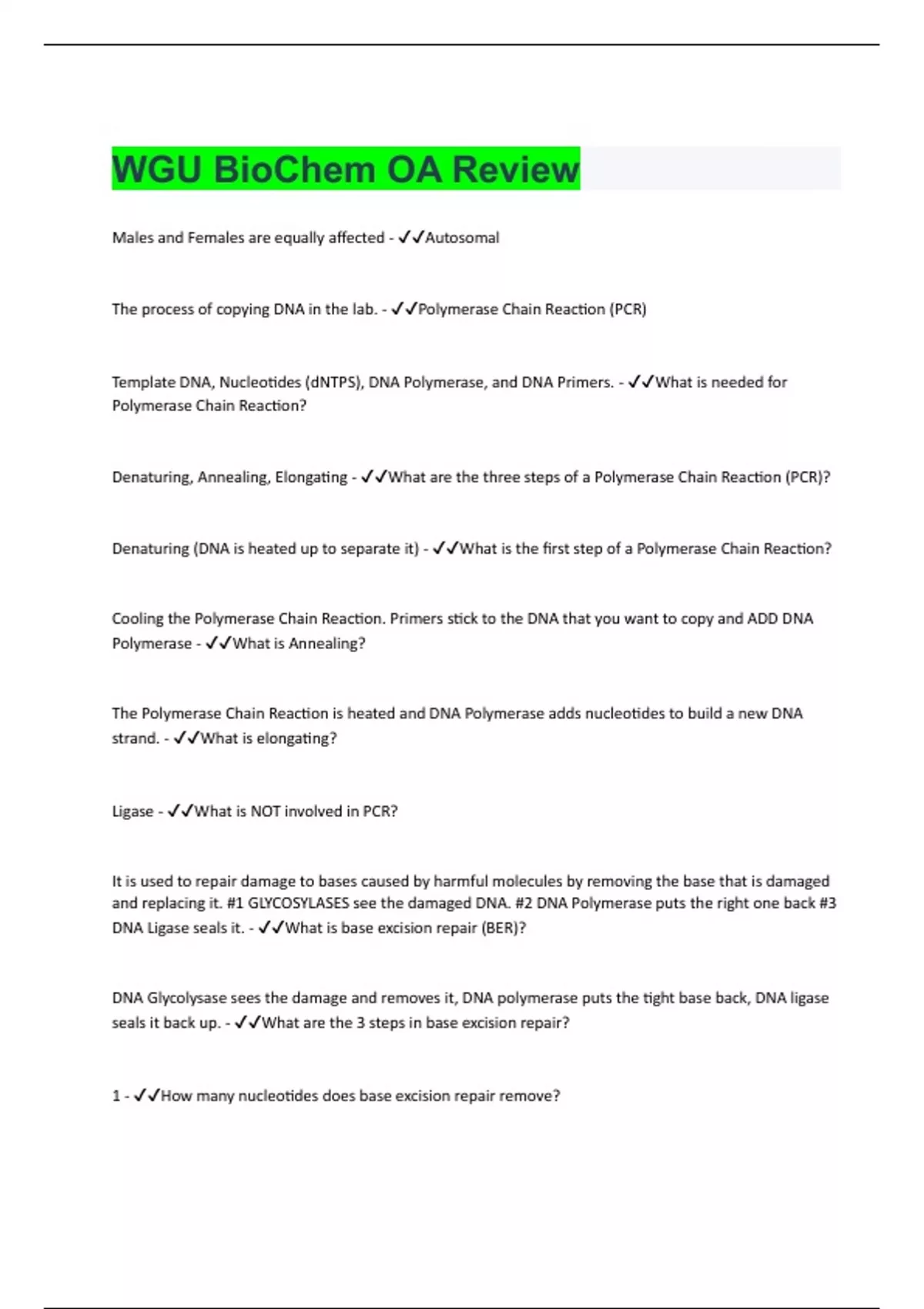 Males and Females are equally affected - Autosomal The process of copying DNA in the lab. - Polymerase Chain Reaction (PCR) Template DNA, Nucleotides (dNTPS), DNA Polymerase, and DNA Primers. - What is needed for Polymerase Chain Reaction? Denaturing, Annealing, Elongating - What are the three steps of a Polymerase Chain Reaction (PCR)? Denaturing (DNA is heated up to separate it) - What is the first step of a Polymerase Chain Reaction? Cooling the Polymerase Chain Reaction. Primers stick to the DNA that you want to copy and ADD DNA Polymerase - What is Annealing? The Polymerase Chain Reaction is heated and DNA Polymerase adds nucleotides to build a new DNA strand. - What is elongating? Ligase - What is NOT involved in PCR? It is used to repair damage to bases caused by harmful molecules by removing the base that is damaged and replacing it. #1 GLYCOSYLASES see the damaged DNA. #2 DNA Polymerase puts the right one back #3 DNA Ligase seals it. - What is base excision repair (BER)? DNA Glycolysase sees the damage and removes it, DNA polymerase puts the tight base back, DNA ligase seals it back up. - What are the 3 steps in base excision repair? 1 - How many nucleotides does base excision repair remove?