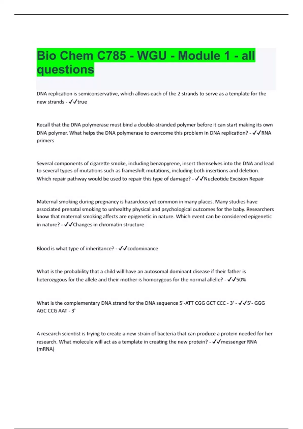 A replication is semiconservative, which allows each of the 2 strands to serve as a template for the new strands - true Recall that the DNA polymerase must bind a double-stranded polymer before it can start making its own DNA polymer. What helps the DNA polymerase to overcome this problem in DNA replication? - RNA primers Several components of cigarette smoke, including benzopyrene, insert themselves into the DNA and lead to several types of mutations such as frameshift mutations, including both insertions and deletion. Which repair pathway would be used to repair this type of damage? - Nucleotide Excision Repair Maternal smoking during pregnancy is hazardous yet common in many places. Many studies have associated prenatal smoking to unhealthy physical and psychological outcomes for the baby. Researchers know that maternal smoking affects are epigenetic in nature. Which event can be considered epigenetic in nature? - Changes in chromatin structure Blood is what type of inheritance? - codominance What is the probability that a child will have an autosomal dominant disease if their father is heterozygous for the allele and their mother is homozygous for the normal allelle? - 50% What is the complementary DNA strand for the DNA sequence 5'-ATT CGG GCT CCC - 3' - 5'- GGG AGC CCG AAT - 3' A research scientist is trying to create a new strain of bacteria that can produce a protein needed for her research. What molecule will act as a template in creating the new protein? - messenger RNA (mRNA)