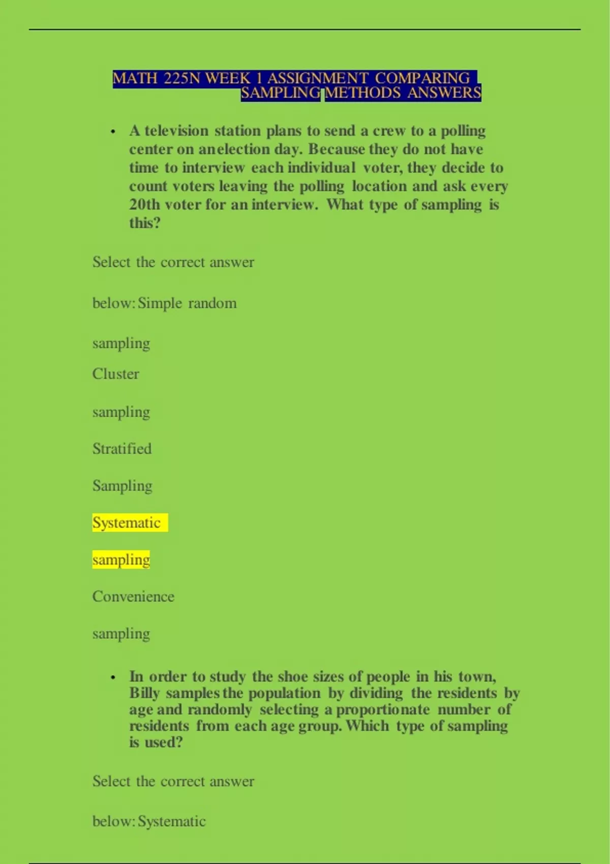 MATH 225N WEEK 1 ASSIGNMENT COMPARING SAMPLING METHODS ANSWERS