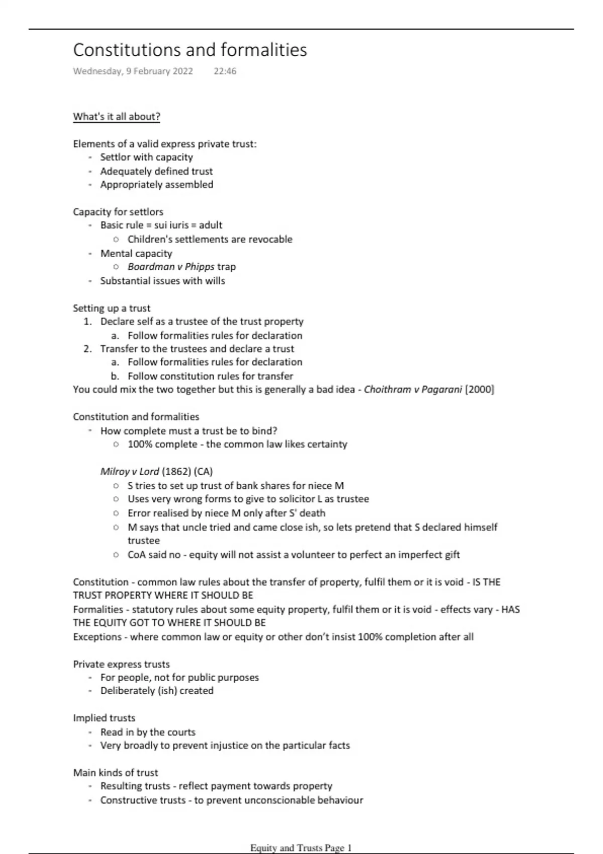 Notes on the constitutions and formalities in the law of equity and trusts - case notes, overview etc