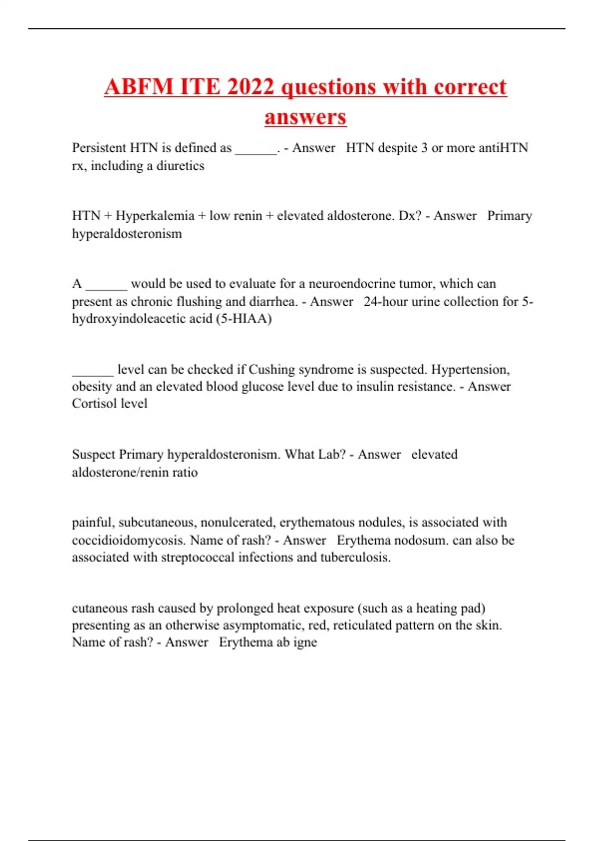 Persistent HTN is defined as ______. - Answer HTN despite 3 or more antiHTN rx, including a diuretics HTN + Hyperkalemia + low renin + elevated aldosterone. Dx? - Answer Primary hyperaldosteronism A ______ would be used to evaluate for a neuroendocrine tumor, which can present as chronic flushing and diarrhea. - Answer 24-hour urine collection for 5-hydroxyindoleacetic acid (5-HIAA) ______ level can be checked if Cushing syndrome is suspected. Hypertension, obesity and an elevated blood glucose level due to insulin resistance. - Answer Cortisol level Suspect Primary hyperaldosteronism. What Lab? - Answer elevated aldosterone/renin ratio painful, subcutaneous, nonulcerated, erythematous nodules, is associated with coccidioidomycosis. Name of rash? - Answer Erythema nodosum. can also be associated with streptococcal infections and tuberculosis. cutaneous rash caused by prolonged heat exposure (such as a heating pad) presenting as an otherwise asymptomatic, red, reticulated pattern on the skin. Name of rash? - Answer Erythema ab igne Erythematous rash of the face (slapped cheek appearance), arms, and legs associated with parvovirus B19 infection and is usually seen in young