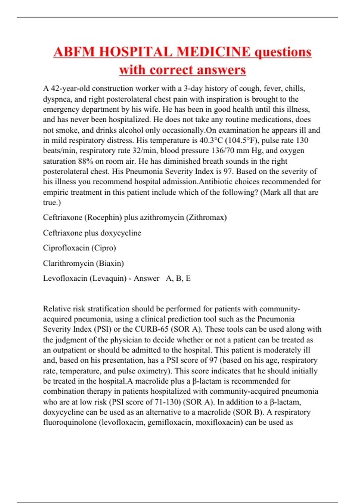 A 42-year-old construction worker with a 3-day history of cough, fever, chills, dyspnea, and right posterolateral chest pain with inspiration is brought to the emergency department by his wife. He has been in good health until this illness, and has never been hospitalized. He does not take any routine medications, does not smoke, and drinks alcohol only occasionally.On examination he appears ill and in mild respiratory distress. His temperature is 40.3°C (104.5°F), pulse rate 130 beats/min, respiratory rate 32/min, blood pressure 136/70 mm Hg, and oxygen saturation 88% on room air. He has diminished breath sounds in the right posterolateral chest. His Pneumonia Severity Index is 97. Based on the severity of his illness you recommend hospital admission.Antibiotic choices recommended for empiric treatment in this patient include which of the following? (Mark all that are true.) Ceftriaxone (Rocephin) plus azithromycin (Zithromax) Ceftriaxone plus doxycycline Ciprofloxacin (Cipro) Clarithromycin (Biaxin) Levofloxacin (Levaquin) - Answer A, B, E Relative risk stratification should be performed for patients with community-acquired pneumonia, using a clinical prediction tool such as the Pneumonia Severity Index (PSI) or the CURB-65 (SOR A). These tools can be used along with the judgment of the physician to decide whether or not a patient can be treated as an outpatient or should be admitted to the hospital. This patient is moderately ill and, based on his presentation, has a PSI score of 97 (based on his age, respiratory rate, temperature, and pulse oximetry). This score indicates that he should initially be treated in the hospital.A macrolide plus a β-lactam is recommended for combination therapy in patients hospitalized with community-acquired pneumonia who are at low risk (PSI score of 71-130) (SOR A). In addition to a β-lactam, doxycycline can be used as an alternative to a macrolide (SOR B). A respiratory fluoroquinolone (levofloxacin, gemifloxacin, moxifloxacin) can be used as